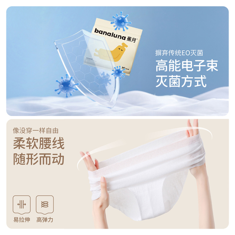 「日抛更卫生,免洗更方便」,采用高能电子束灭菌(物理灭菌)无残存有害化学气体(摒弃EO灭菌),人工零接触,双层加长加宽底裆,不夹臀不卡裆,独立包装,孕期,旅行也是必备品哦~