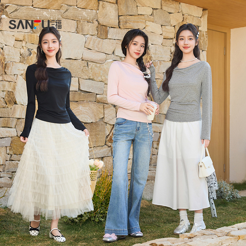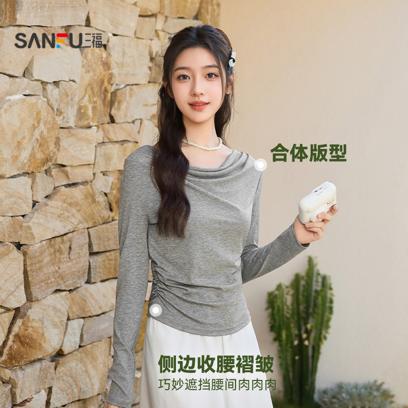2026春季新款三福长袖T恤,荡领褶皱设计,收腰显瘦,一字领休闲风,质感舒适,适合日常穿搭!