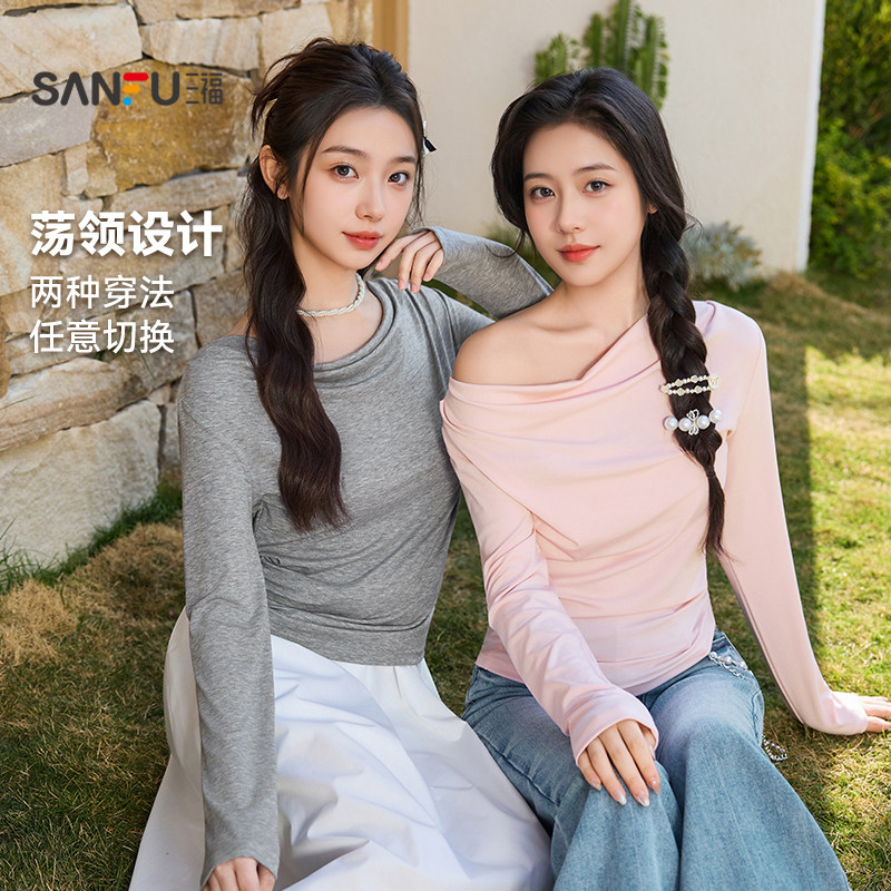 三福长袖T恤2026新款春季荡领褶皱收腰一字领休闲上衣女装514477