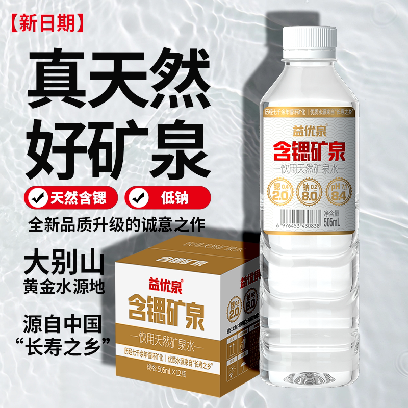 真正的天然矿泉水!泡茶绝配 三睿饮品•益优泉天然矿泉水505ml*12瓶 14.9亓,折1.2亓/瓶 深层天然矿泉,富含锶与偏硅酸,低钠更健康 每一口都是清冽和甘甜,趁现在划算赶紧囤!