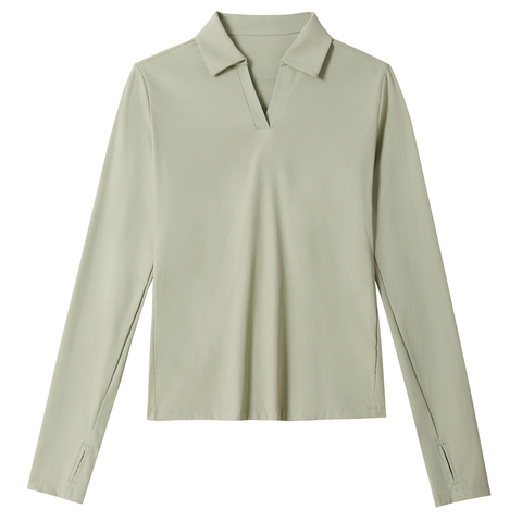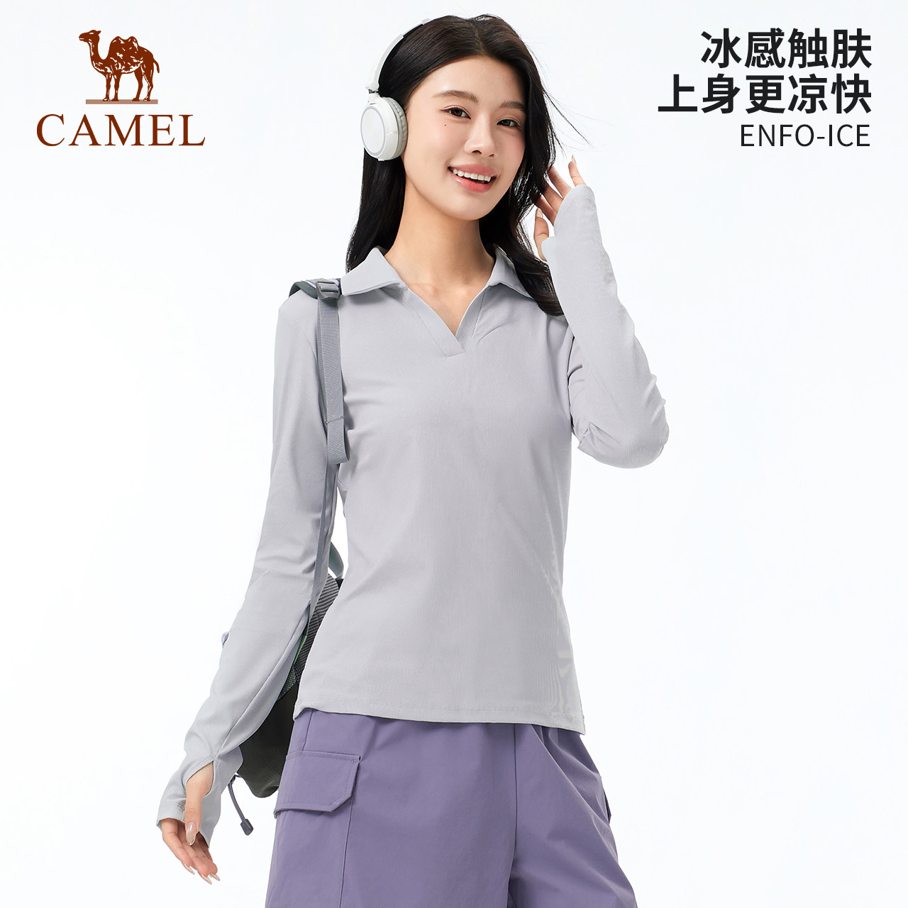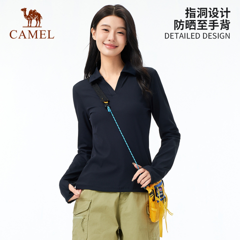 骆驼户外速干POLO衫女打底衫长袖V字弹力抗皱凉感透气吸湿防晒T恤
