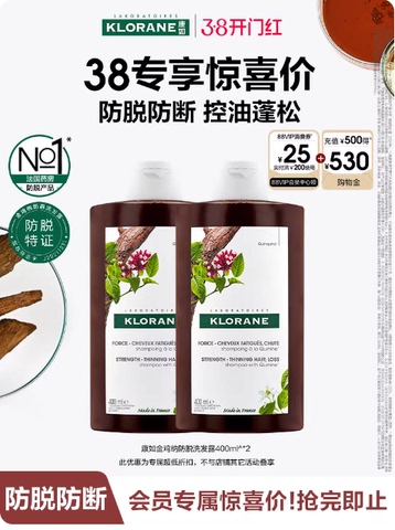 【官方立减36,限时补贴10元,消费券抵扣17.8元,到手130.19】法国康如金鸡纳防脱发洗发水400ml*2,品质优选。