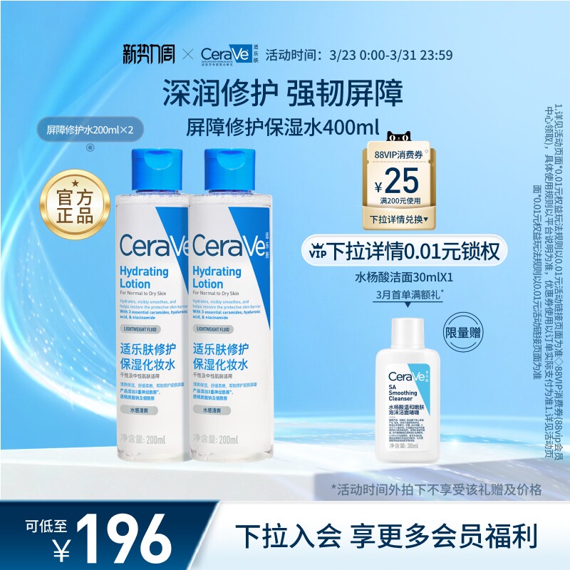 【券满129减15!官方立减16元!店铺新客再减7元!】CeraVe适乐肤屏障修护爽肤水,舒缓保湿,强韧肌肤屏障。500ml大容量,适合日常护肤及湿敷使用,温和不刺激,敏感肌也可安心用!