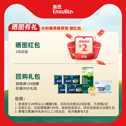 【2阶加钙】英氏米粉婴儿辅食宝宝营养加钙米粉粉米糊3段罐装6月+ 【售价】:¥54.15 【券后】:¥40.15 【优惠券】:¥14 推荐理由:米粉2罐领券14元,叠官方立减12%,2瓶到手价99.6/2罐(49.8/瓶); 赠品:加厚加大棉柔巾1包+米粉30g+核桃油尝鲜6ml。米粉中不添加多余成分,充分满足宝宝日常所需,维C加铁口感细腻,吸收加倍,全方位守护宝宝健康成长!【赠运费险】 👉复制这条信息打开【手机淘宝APP】即可领券购买:/