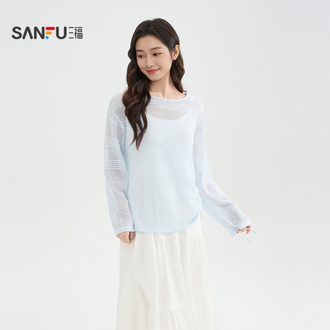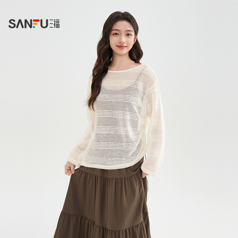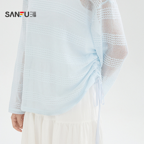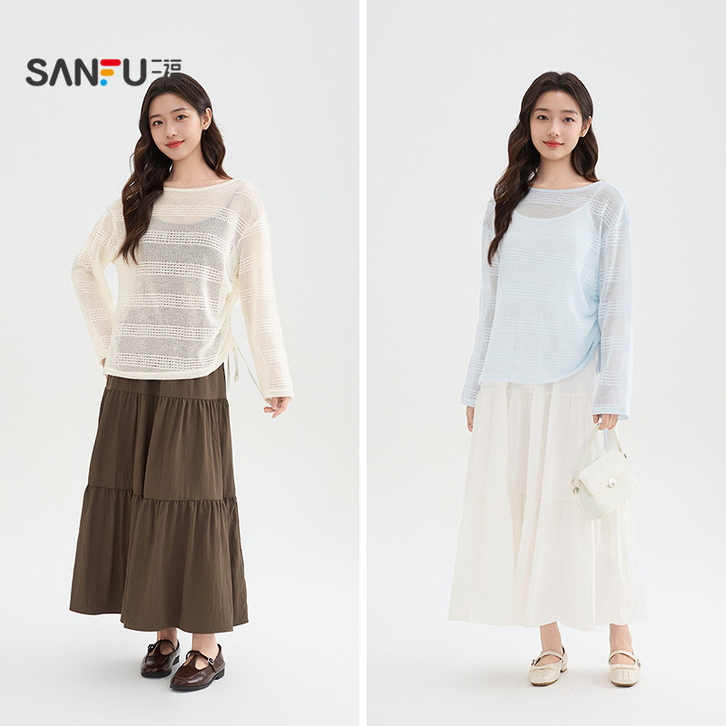 三福长袖T恤2026新款春季荡领褶皱收腰一字领休闲上衣女装514477