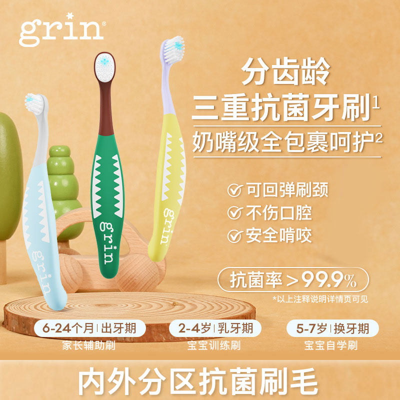 【平台优惠24.29元,到手价29.71元】grin儿童牙刷婴幼儿专用软毛牙刷,超细柔圆头软毛,呵护娇嫩牙龈不伤牙。小巧刷头适配小嘴,防滑好握,食品级安全材质,分龄护齿,轻松清洁乳牙,让宝宝爱上刷牙。