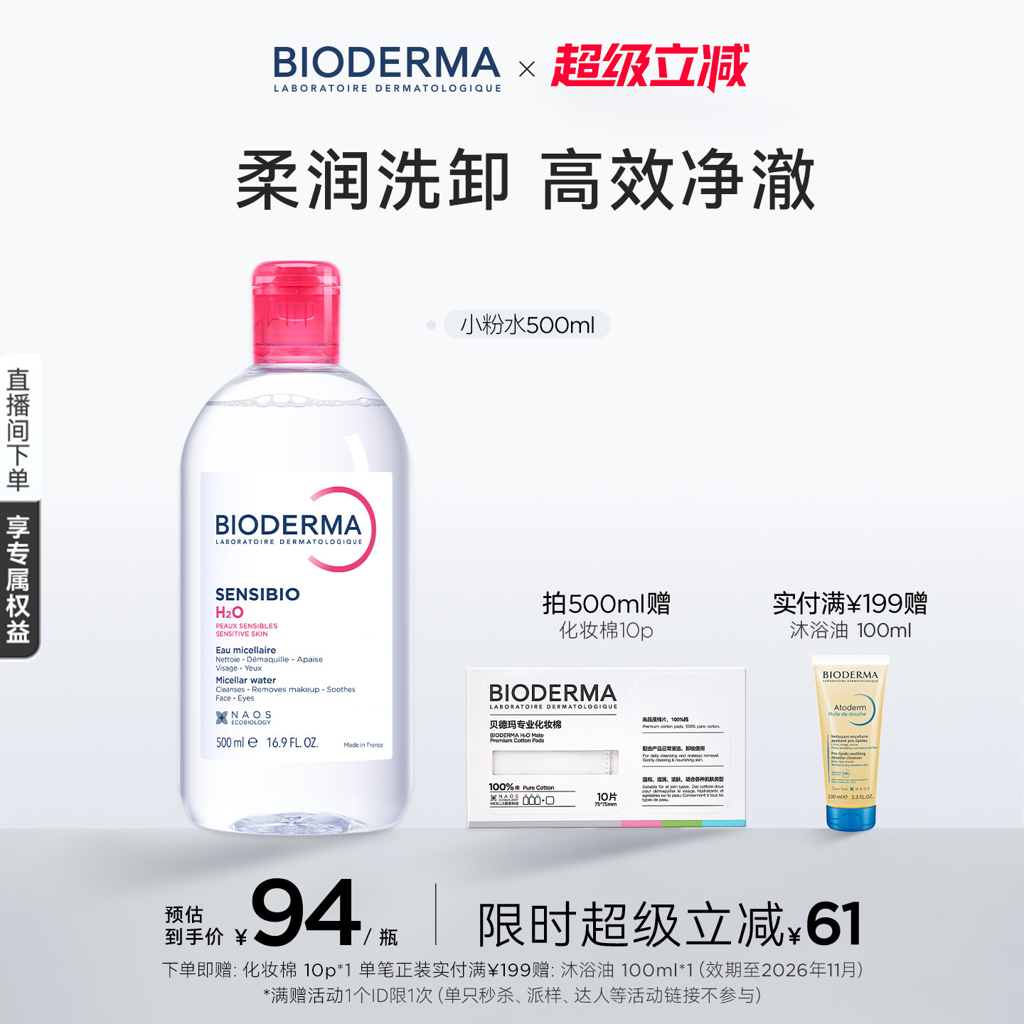 【叠加淘金币3.16元,到手90.84元,拍600mI赠: 化妆棉10p 实付满¥199赠沐浴油 100ml】贝德玛粉水敏感肌洗卸春敏季温和不伤肤,超赞!