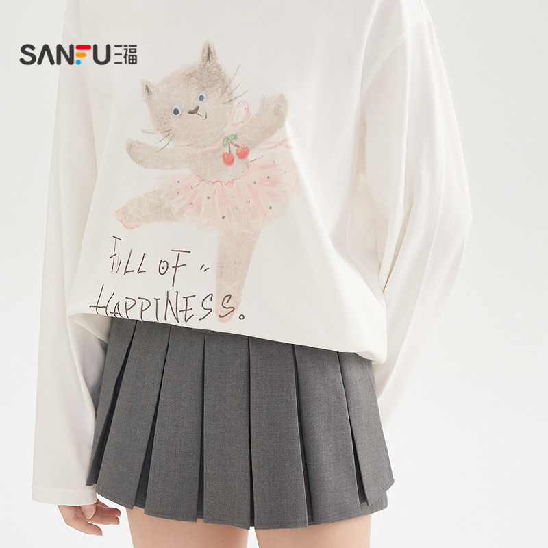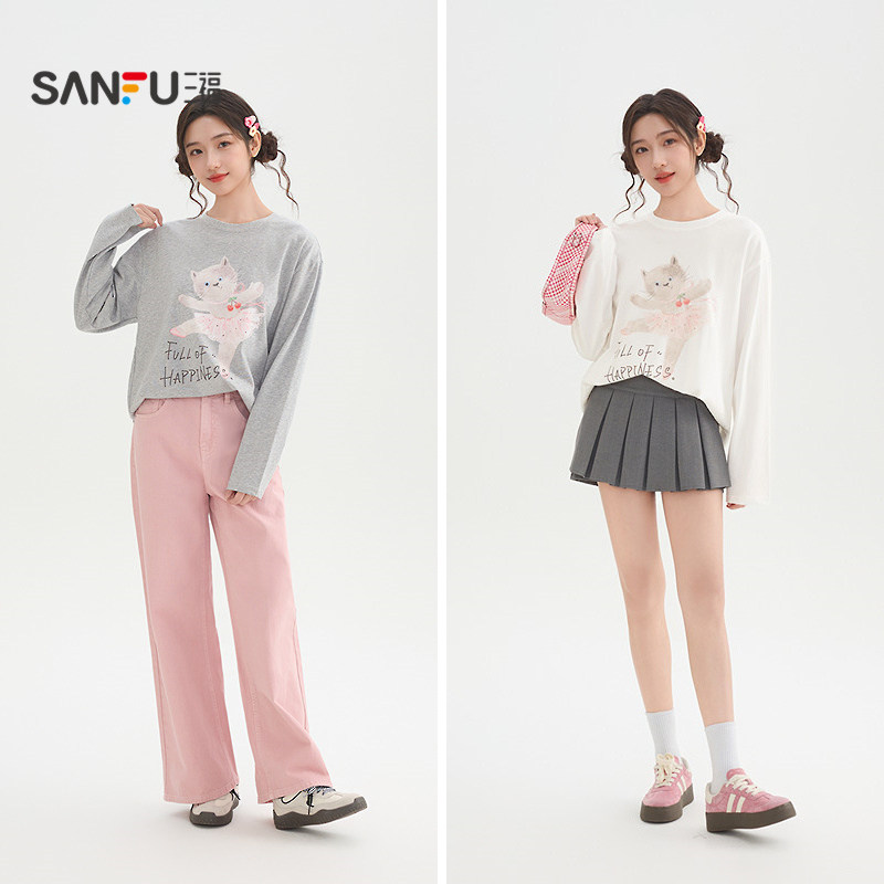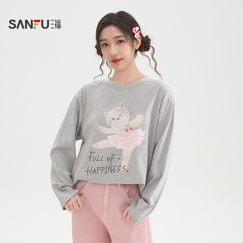 【三福】2026春季新款女式长袖T恤,可爱猫咪印花设计,宽松休闲版型,舒适透气,适合日常穿搭!性价比超高,快来抢购吧!