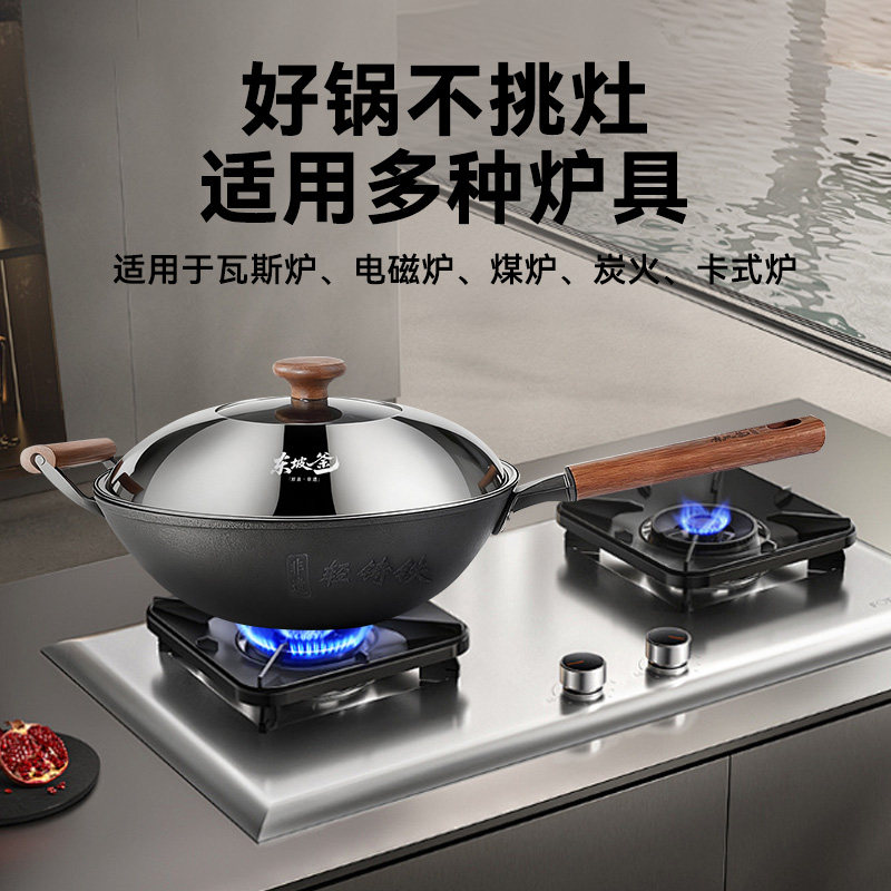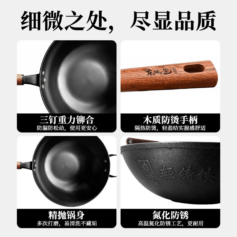 东坡釜郏县铸铁炒锅,家用平底设计,轻量无涂层,电磁炉通用,不粘耐用,炒菜更省心!