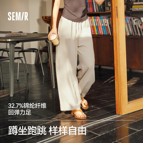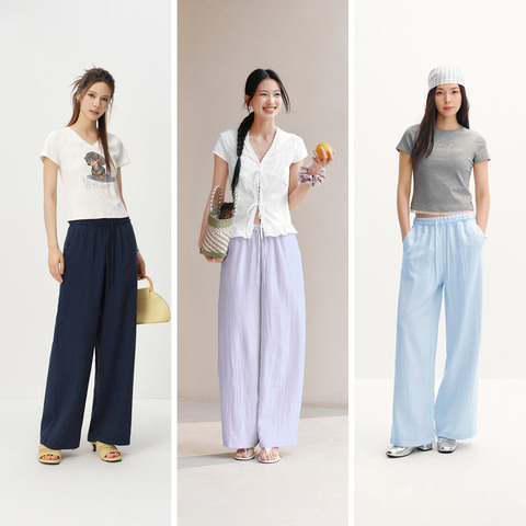 森马休闲裤女夏纯色肌理木耳边松紧腰宽松垂感长裤2026新款阔腿裤