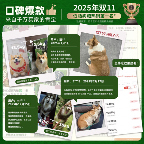 【0元入会】年货节消费券红包,5磅到手208元,25磅大包装,数量较少,先到先得!【5磅到手208元,12磅到手444元,25磅到手719元】低脂无谷里昂全犬粮,有效控制体重,美毛护肤,保持肌肉质量,帮助大脑发育,轻盈配方,控制减重,呵护胰腺健康,老犬骨骼健康,均衡营养易消化,增强免疫力,高蛋白,低脂肪!荣获美国DWJ连续多年推荐!