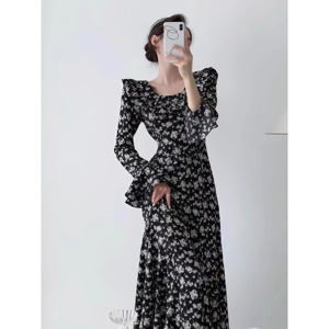 HF 2026新款赫本风法式白裙长袖连衣裙女收腰气质显瘦中长裙