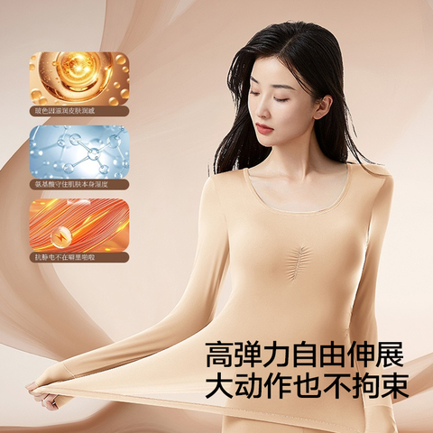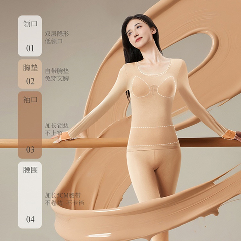轻暖粉底色美肤衣,自带胸垫隐形显瘦,玻尿酸材质亲肤保湿,保暖套装春冬必备!舒适又贴心!4自带胸垫,轻松塑形。