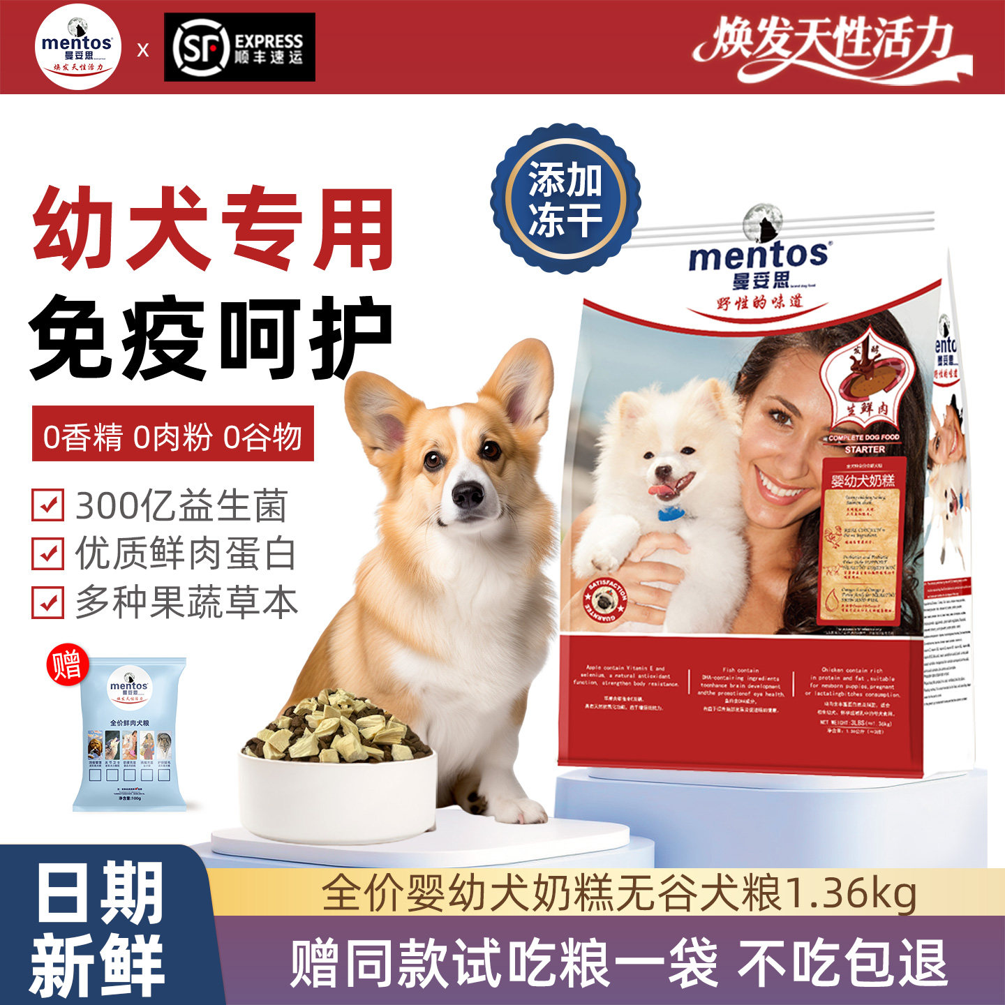送100g试吃!淘金币叠加劵到手58.74元!曼妥思全价婴幼犬狗粮1.36kg,全价奶糕粮·适用于婴幼犬,多肉果蔬,无谷低敏,300亿益生菌,优质鲜肉蛋白,多种果蔬原料,添加乳铁蛋白,营养健康少烦恼