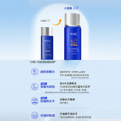 【店铺优惠55.8,平台优惠16.03,88vip减3.35,淘金币在抵9.68元,实际到手53.97元】AHC防晒霜小蓝瓶2.0高倍防护,清爽不油腻,适合面部使用。防晒隔离二合一,有效抵御紫外线,守护肌肤健康。