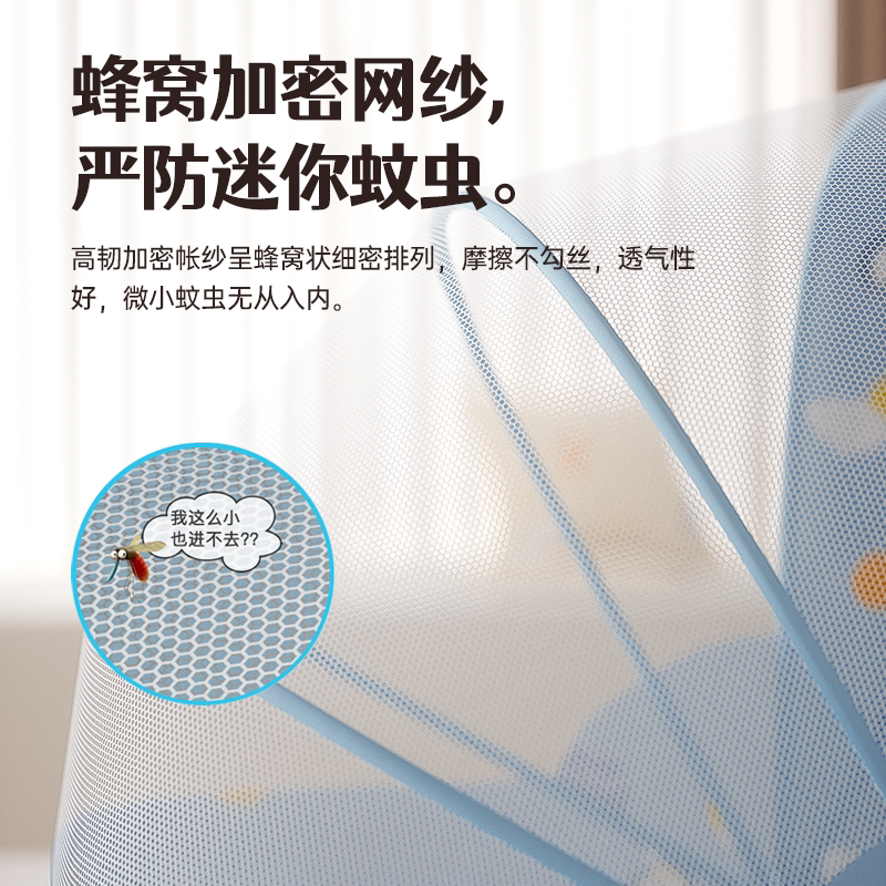 润本婴儿蒙古包蚊帐,免安装可折叠,一秒开合超省心!A类加密网纱,360°全罩防蚊,小黑蚊钻不进。加宽底围不翘边,透气不闷汗,宝宝安睡一整晚。通用尺寸适配多床型,收纳小巧不占地,宝妈必备!