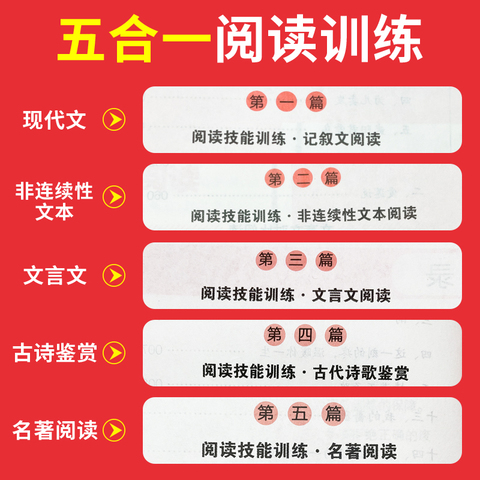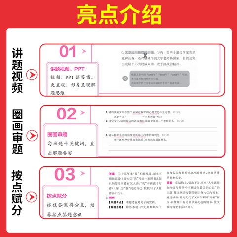 "送三段式答案解析!一本初中语文阅读训练五合一,全国通用,100篇情境好题,100个讲解视频,45个答题公式,讲题视频,圈画审题,按点赋分,提高阅读能力! "