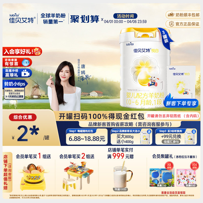 新客专享+150g,荷兰原罐进口羊奶粉!佳贝艾特悦白1段,A2蛋白+天然乳脂+6种核苷酸,亲和易吸收,新客专享超值组合装~科学配比更安心,宝宝肠胃友好之选!