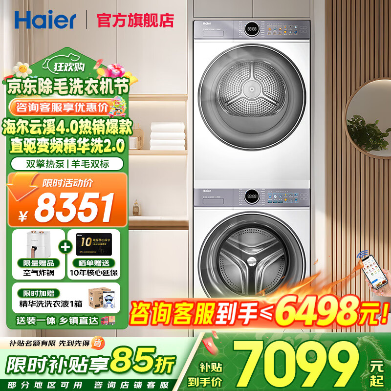 海尔(Haier)云溪5.0/4.0洗烘套装【7AD1/77E/582/27E】AI直驱精华洗洗衣机+双擎热泵烘干机 云溪4.0-77E|直驱精华洗+双擎热泵+AI语音