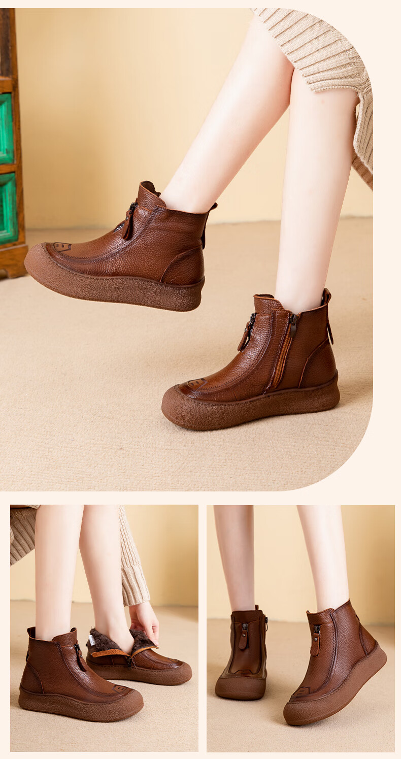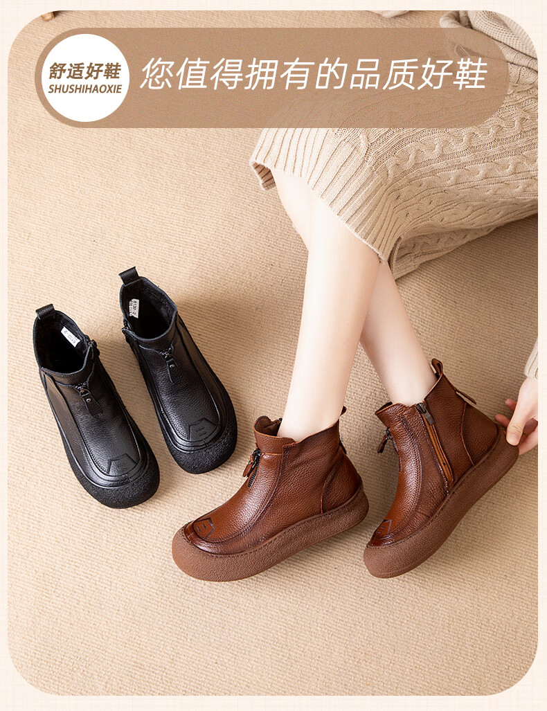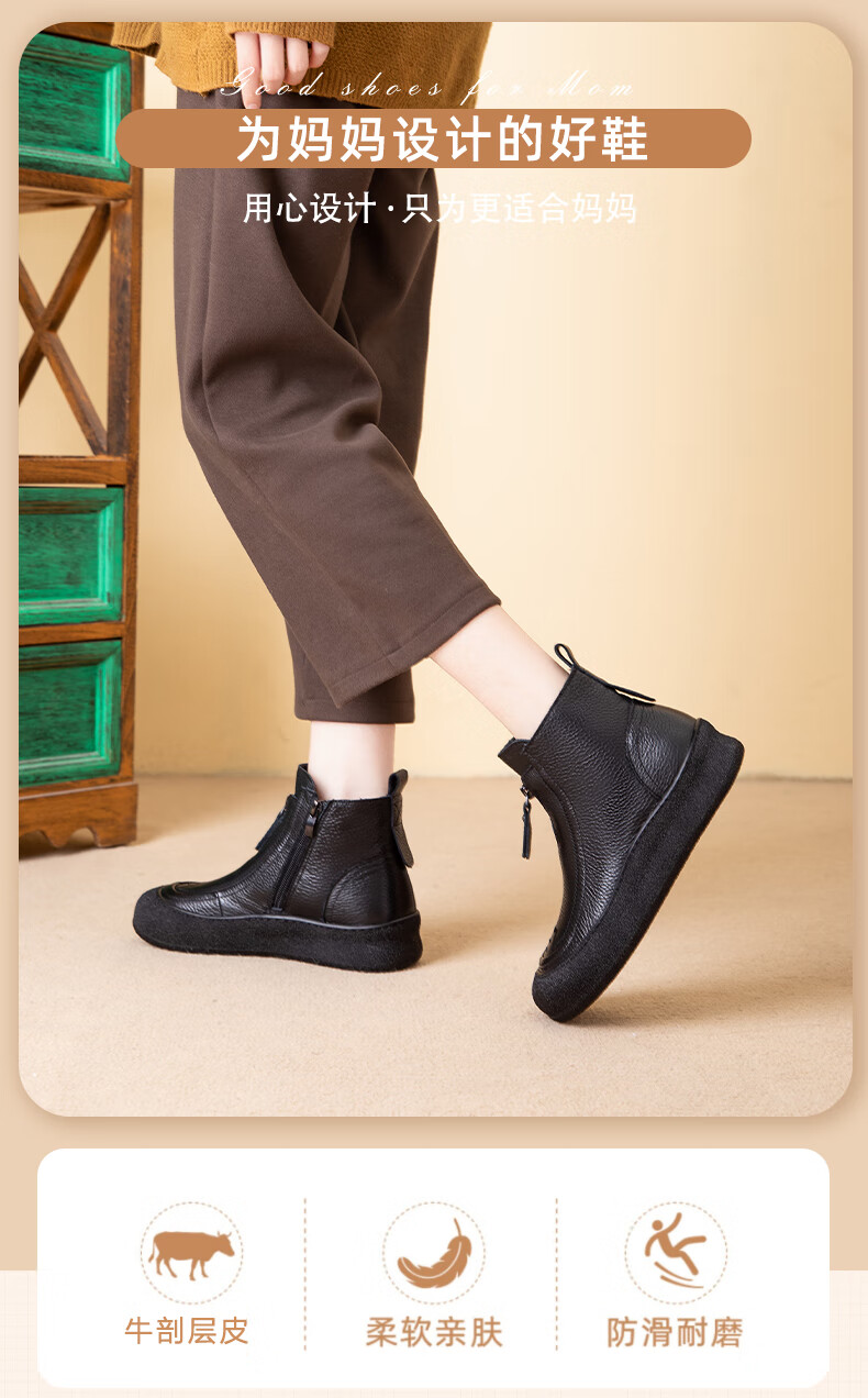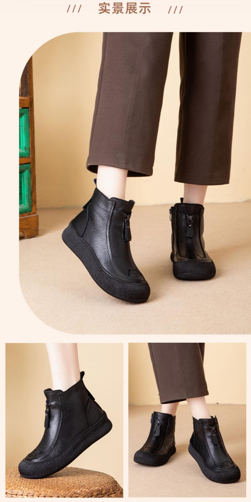 稻草人(MEXICAN)复古真皮厚底马丁靴女2026秋冬新款加绒保暖小短靴软底舒适妈妈鞋 黑色加绒 35