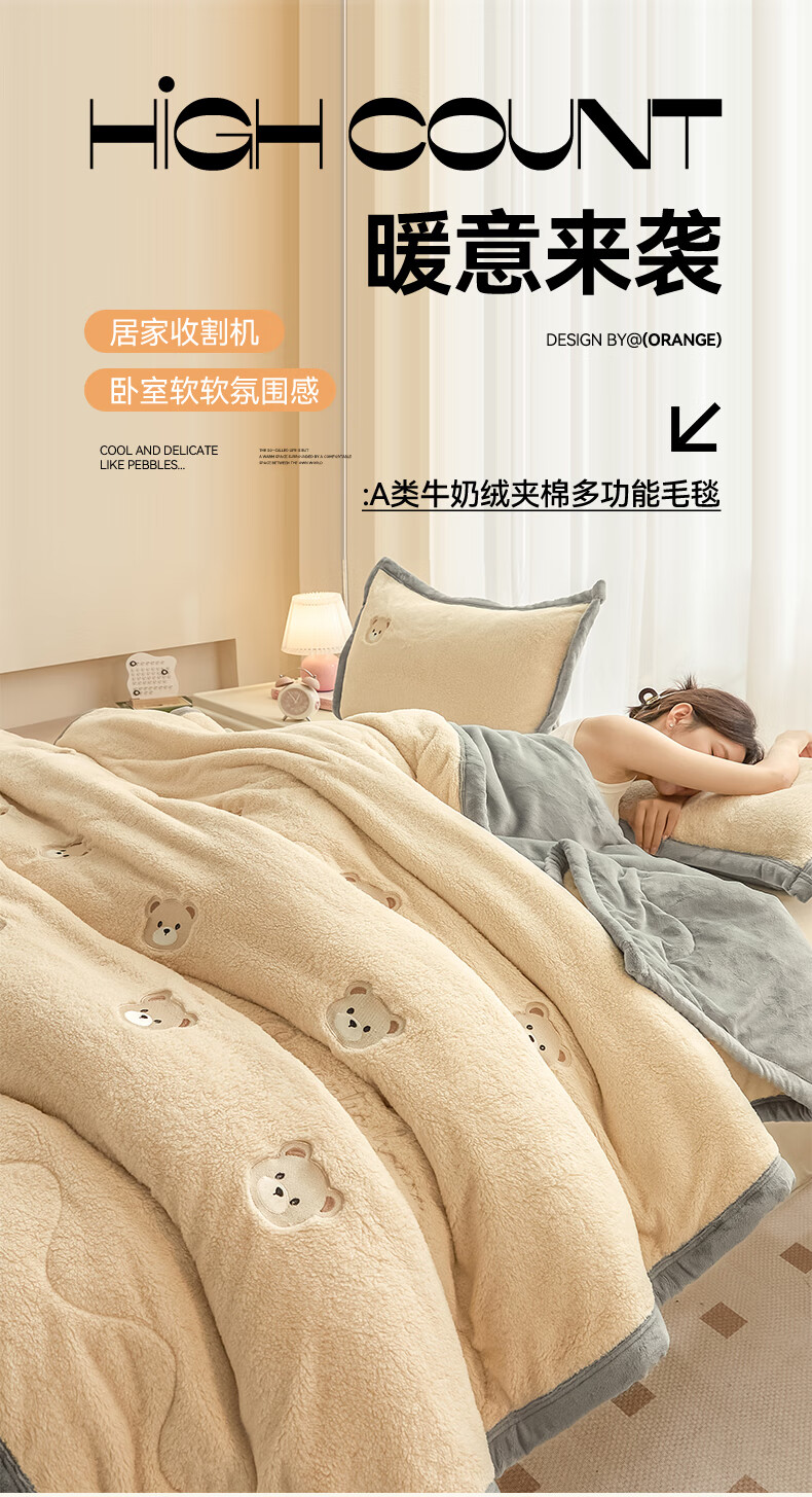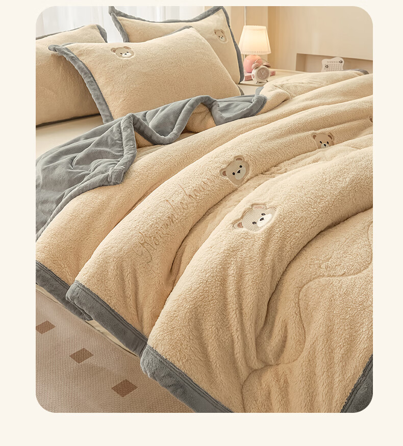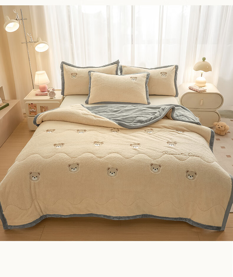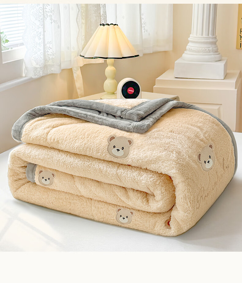 猫人(MiiOW)牛奶绒夹棉毛毯被加厚冬季沙发毯子盖毯办公室午睡毯单双人宿舍 小熊-香槟+经典灰【软糯保暖】 120×200cm【单人盖毯】