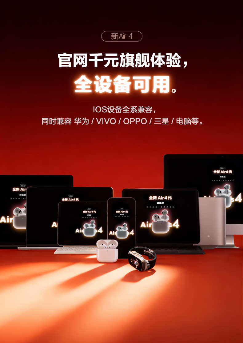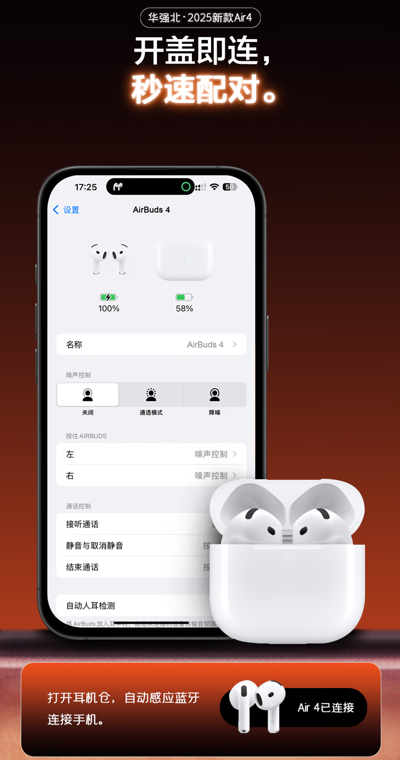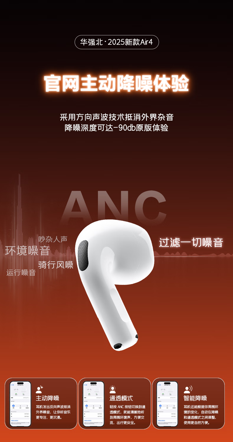 心趣【官新正品丨Air4代降噪款】无线蓝牙耳机适配苹果2025新款半入耳式金榜iphone17/16/15/14pods4 【原版同功能pods4降噪版】 【主动降噪+空间音頻+三真电量】