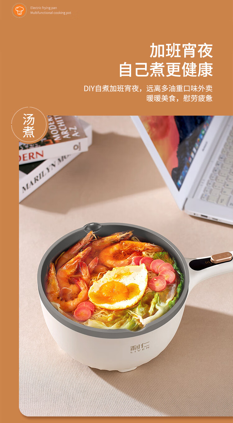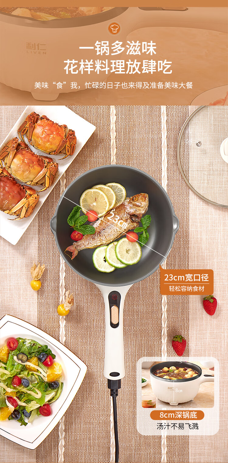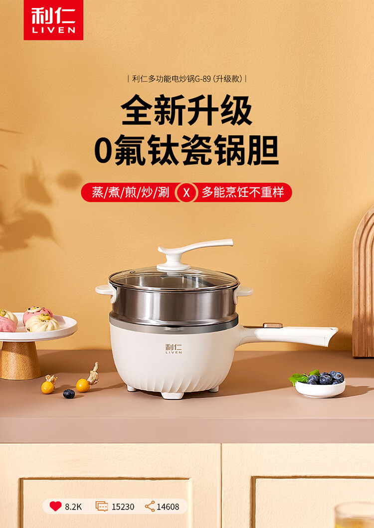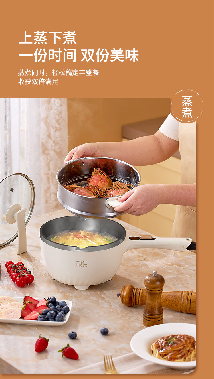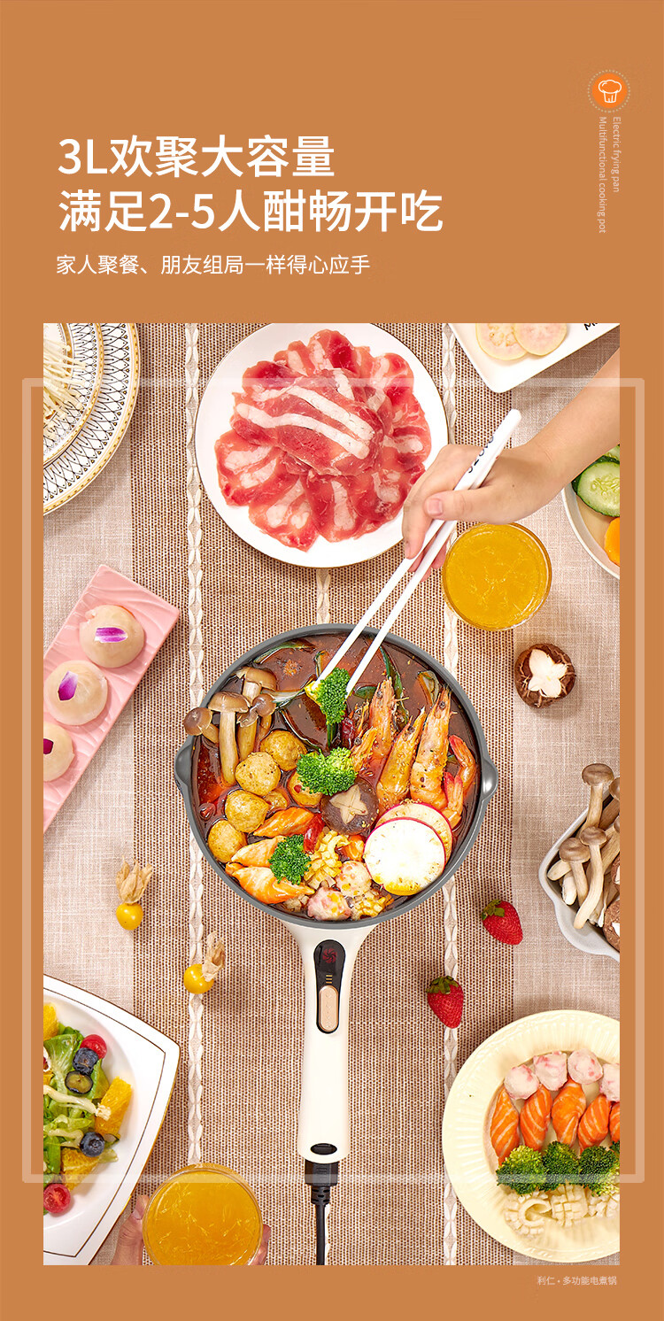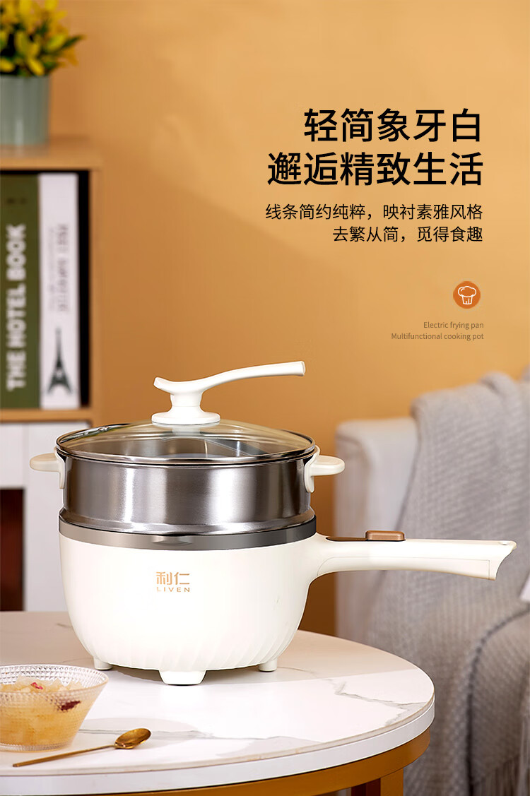利仁(Liven)电炒锅电煮锅电蒸锅电火锅专用锅3升小电锅电热锅多功能电煮锅蒸煮涮烤一体锅配蒸屉G-89 4L 【0氟钛瓷超耐磨】+三档火