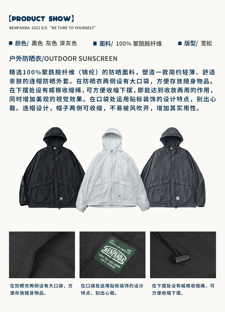 熊猫·本熊猫·本防晒衣男夹克外套夏季新款潮牌宽松百搭户外休闲外衣 深灰色 M