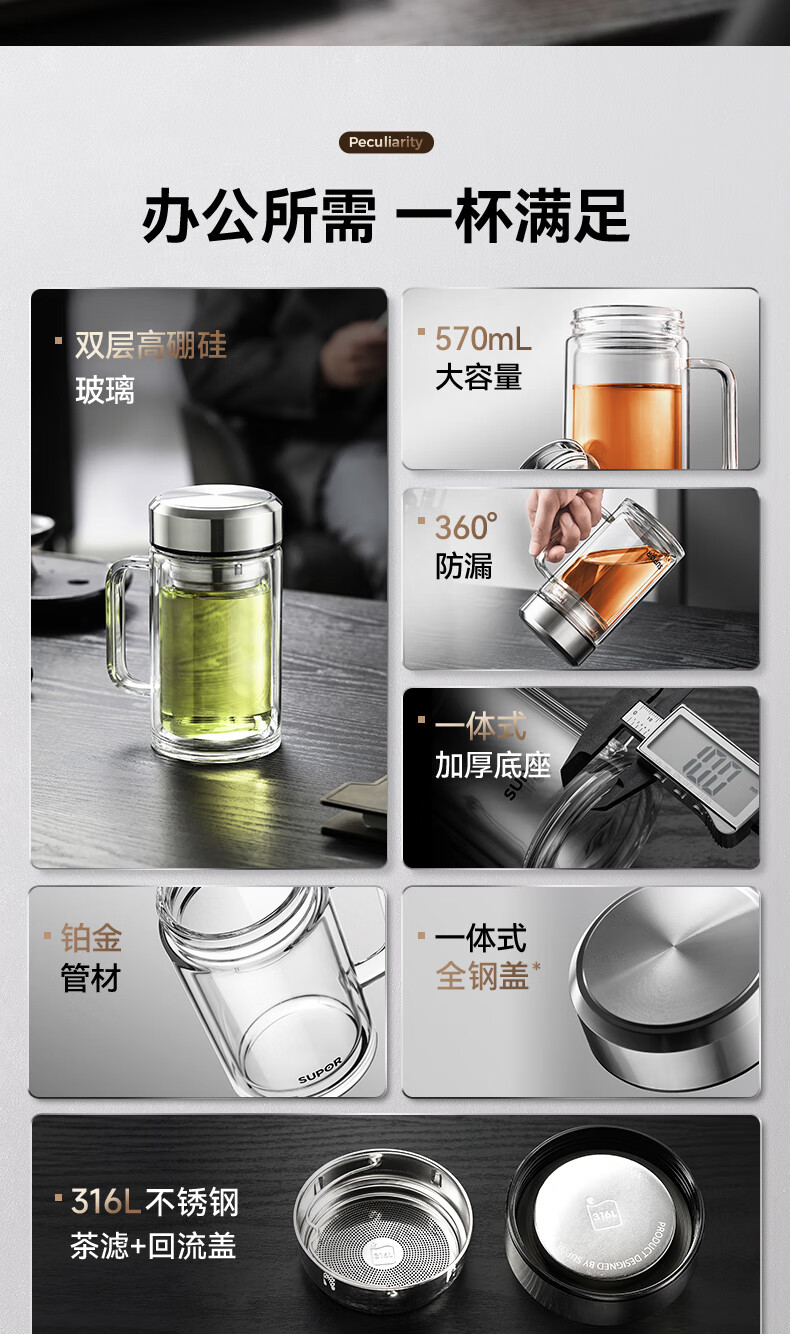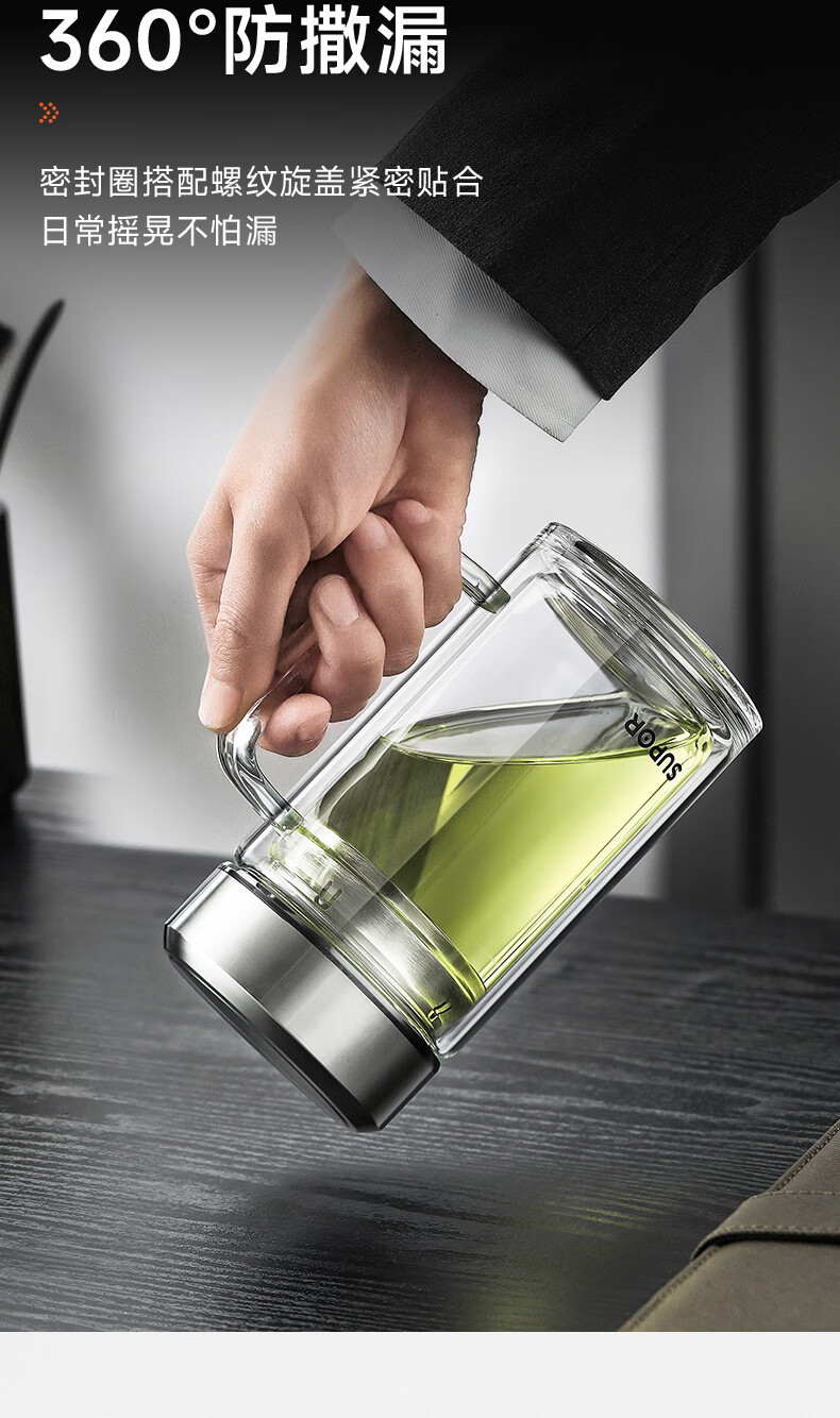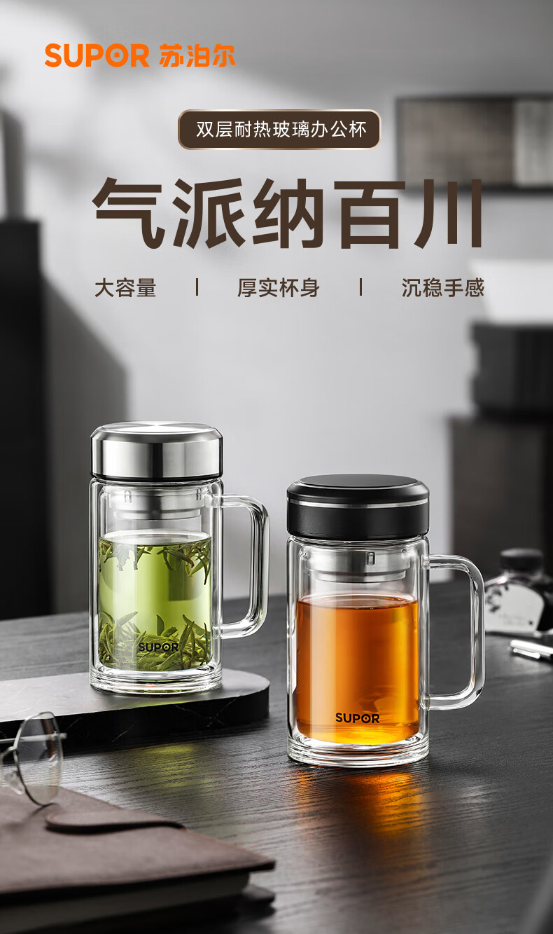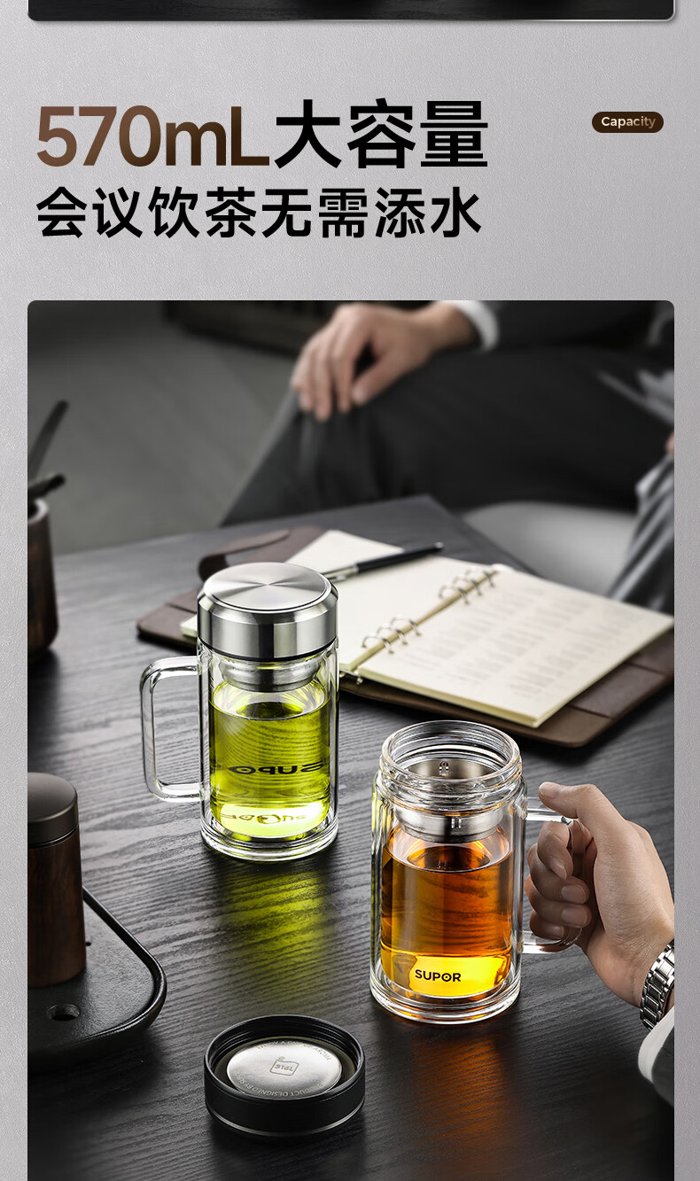 苏泊尔双层玻璃杯男家用商务办公泡茶杯子过滤车载水杯570mL.流光银