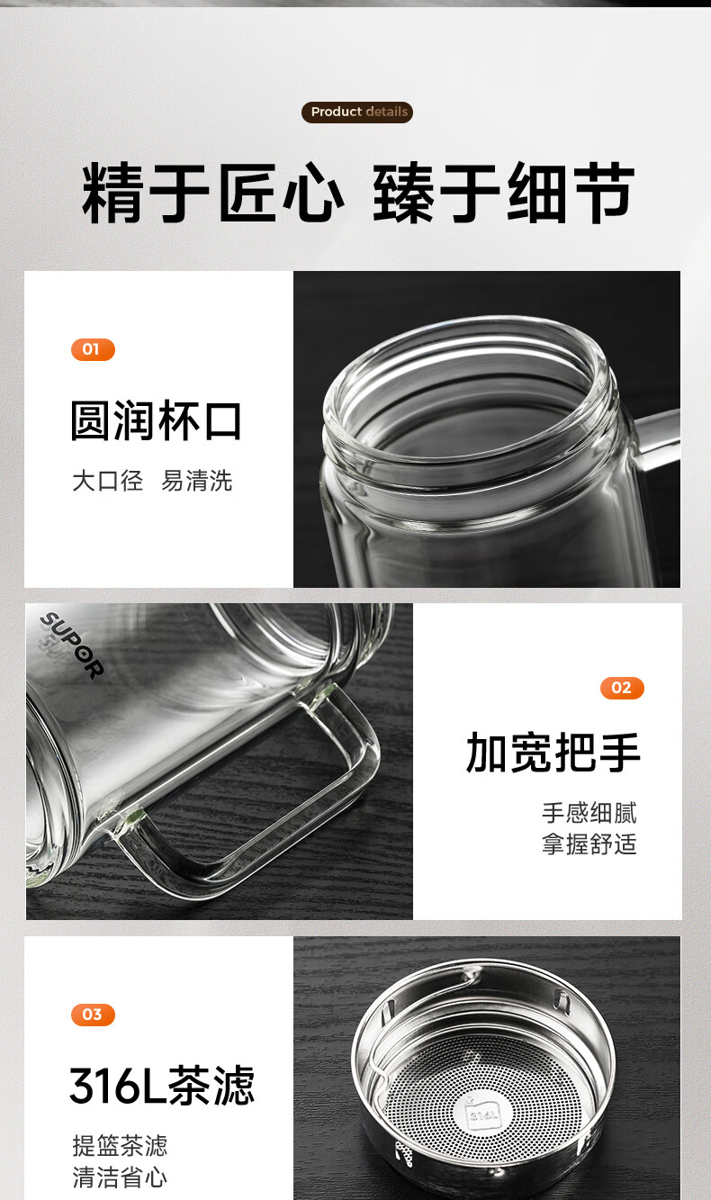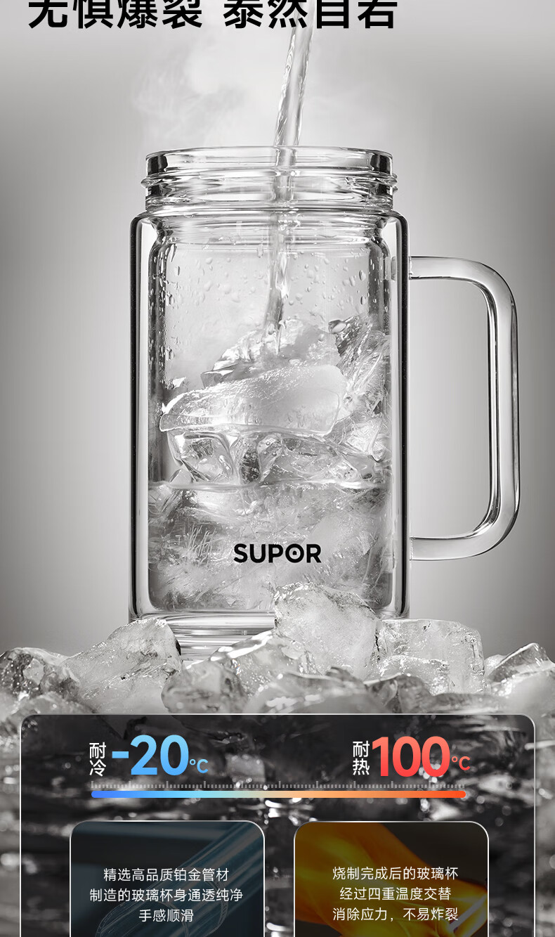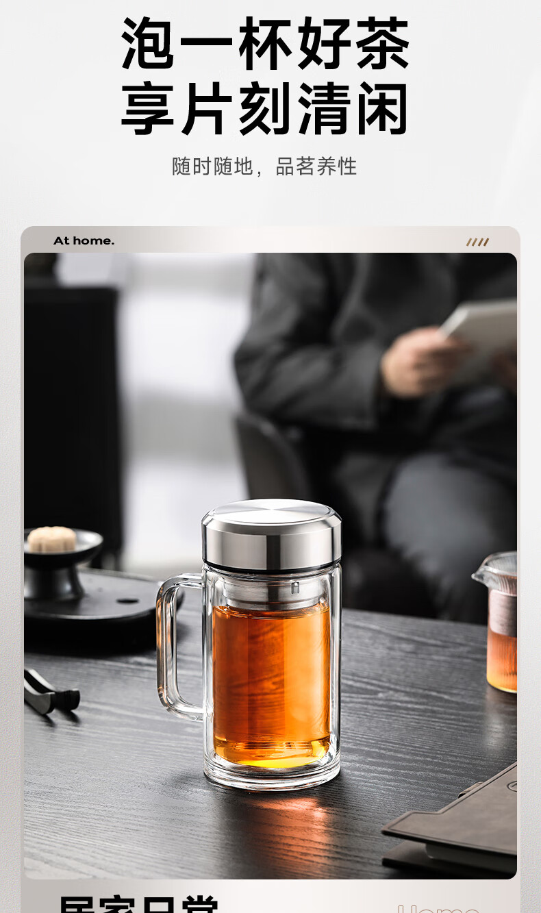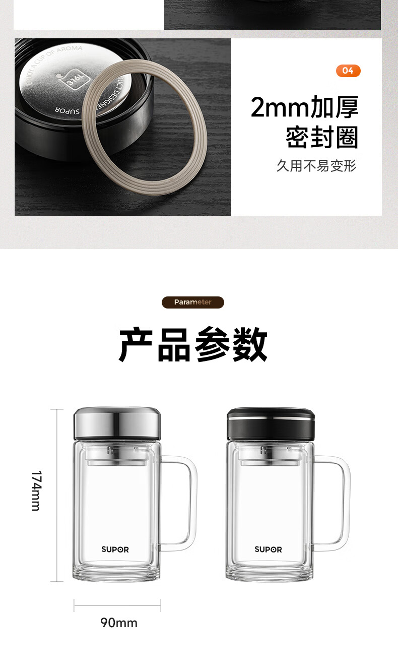 苏泊尔双层玻璃杯男家用商务办公泡茶杯子过滤车载水杯570mL.流光银