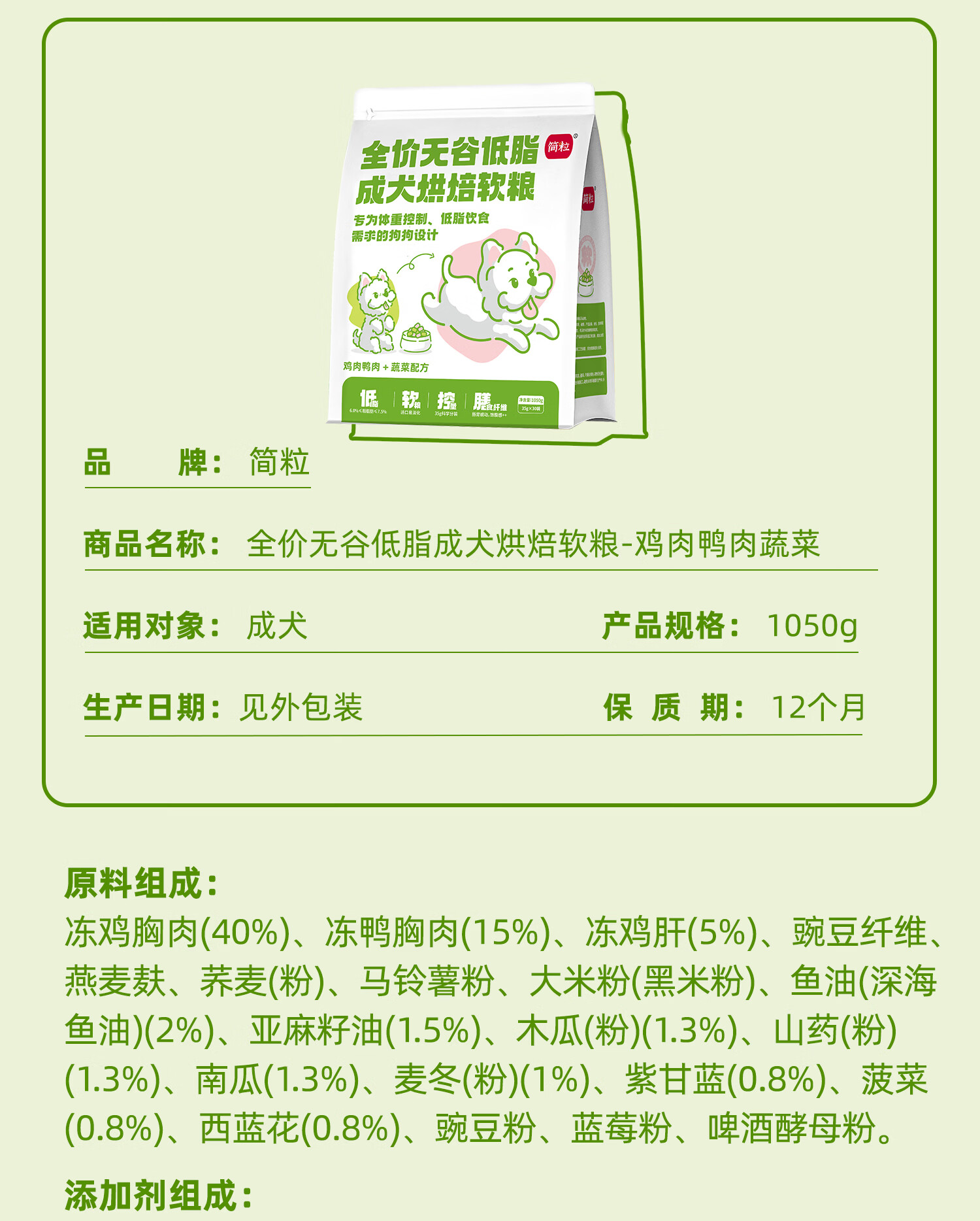 简粒低脂烘焙软粮控体狗粮泰迪比熊胖狗易消化鸡鸭配方无谷 鸡肉鸭肉蔬菜配方