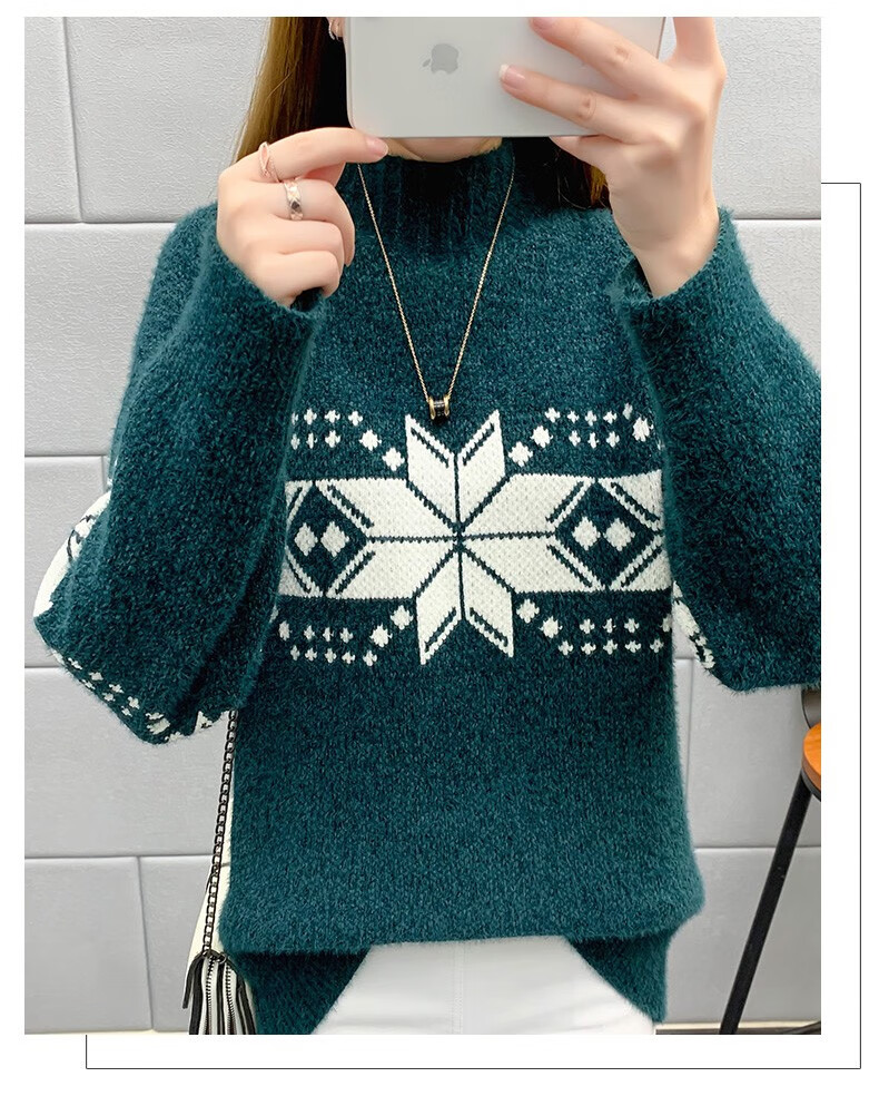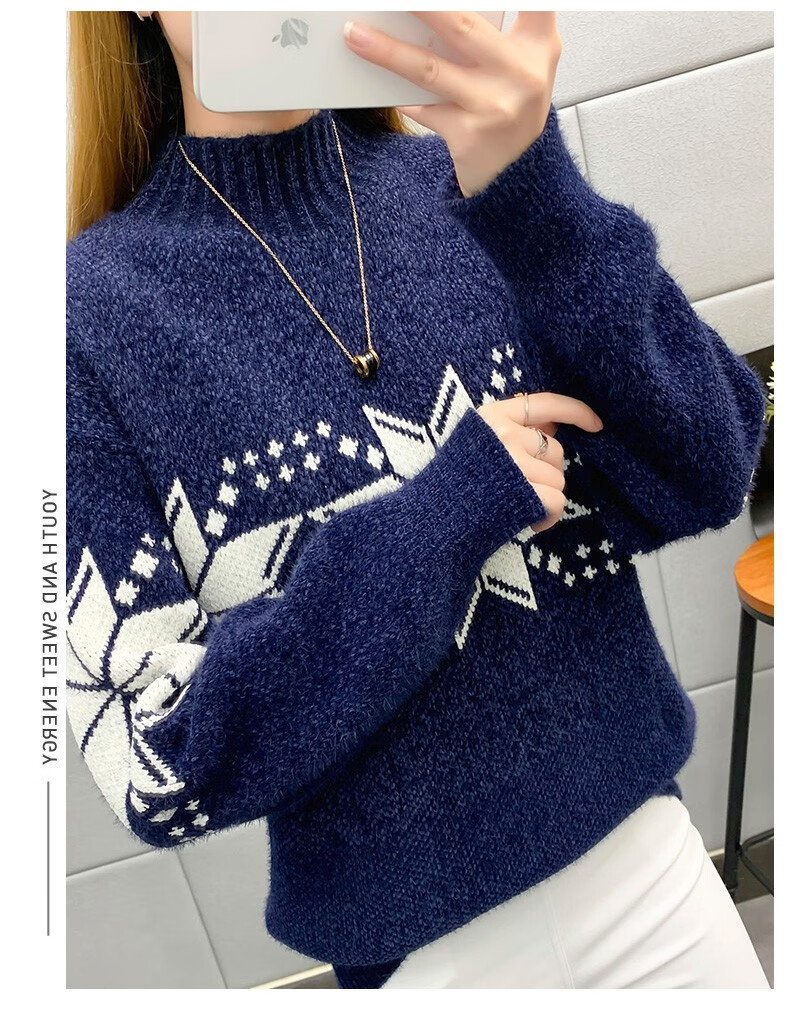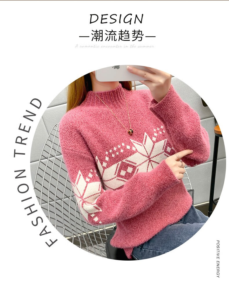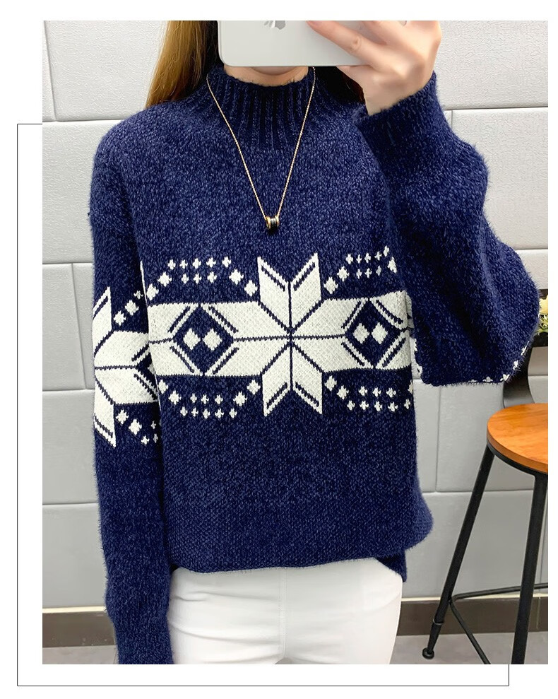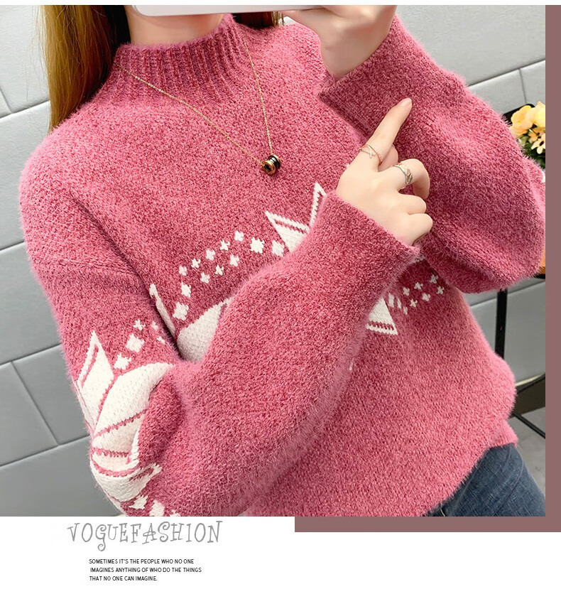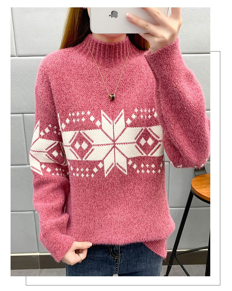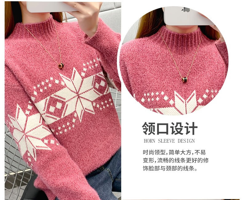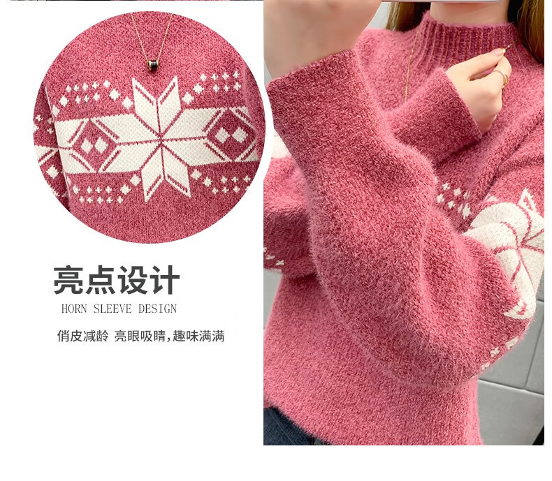 恒源祥针织衫女秋冬装加厚羊毛衫新款女士半高领毛衣女装外穿圣诞上衣 雪花-皮红色 均码 适合体重90-145斤