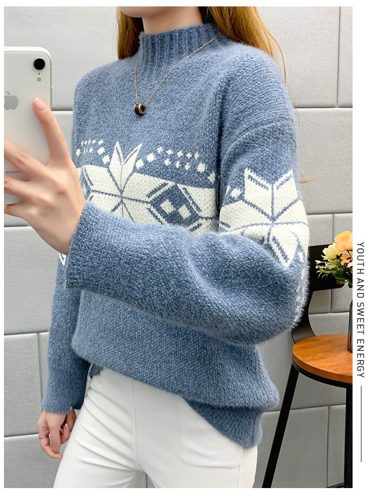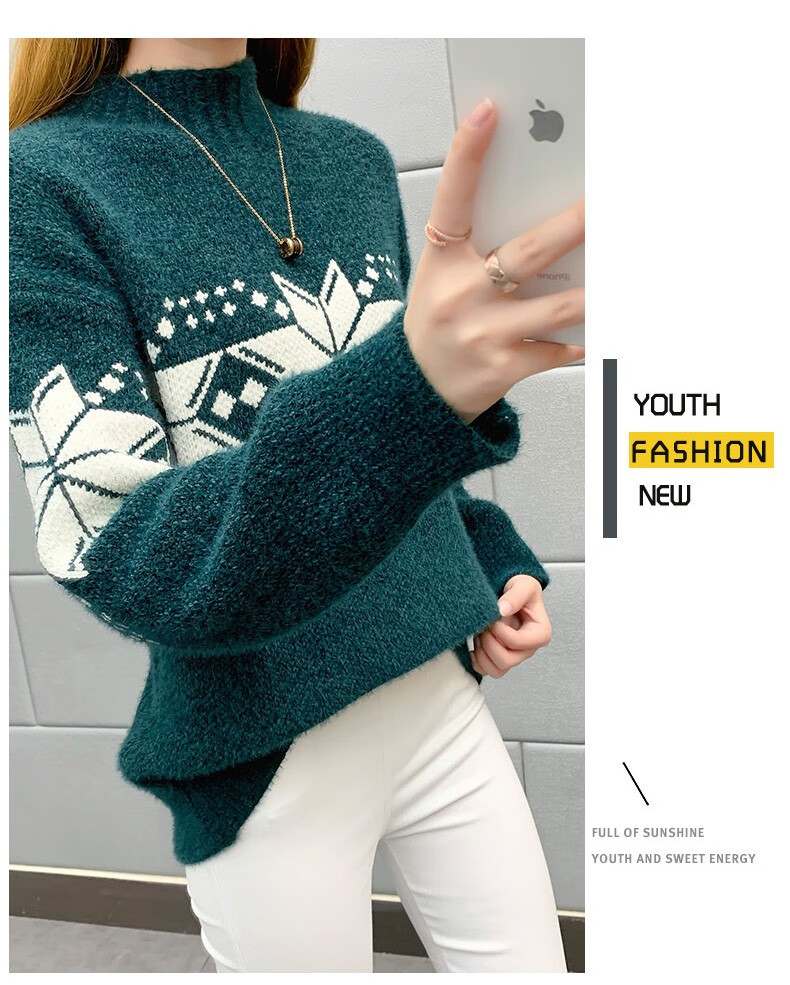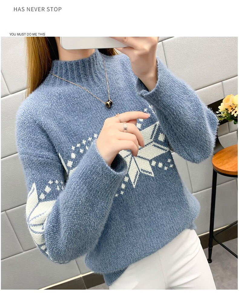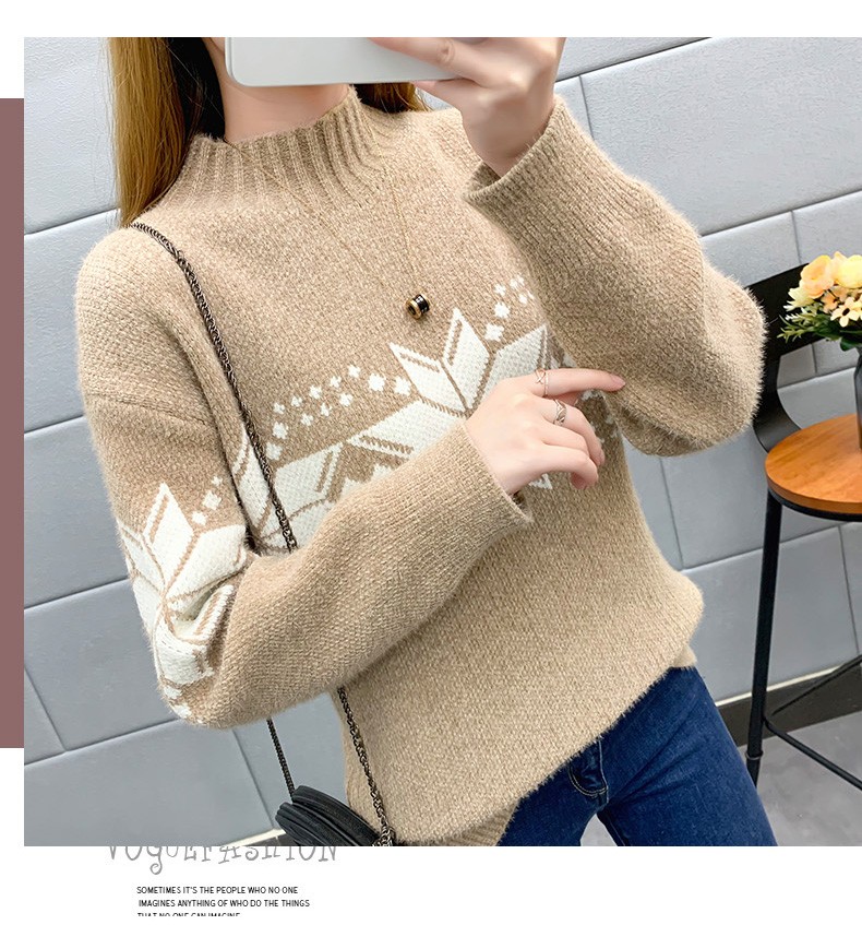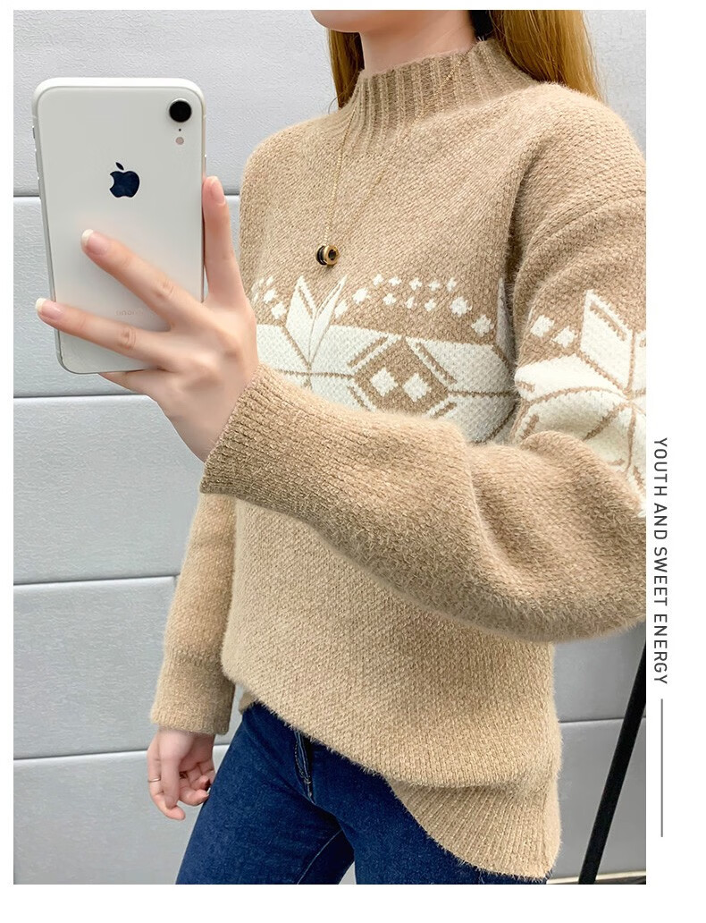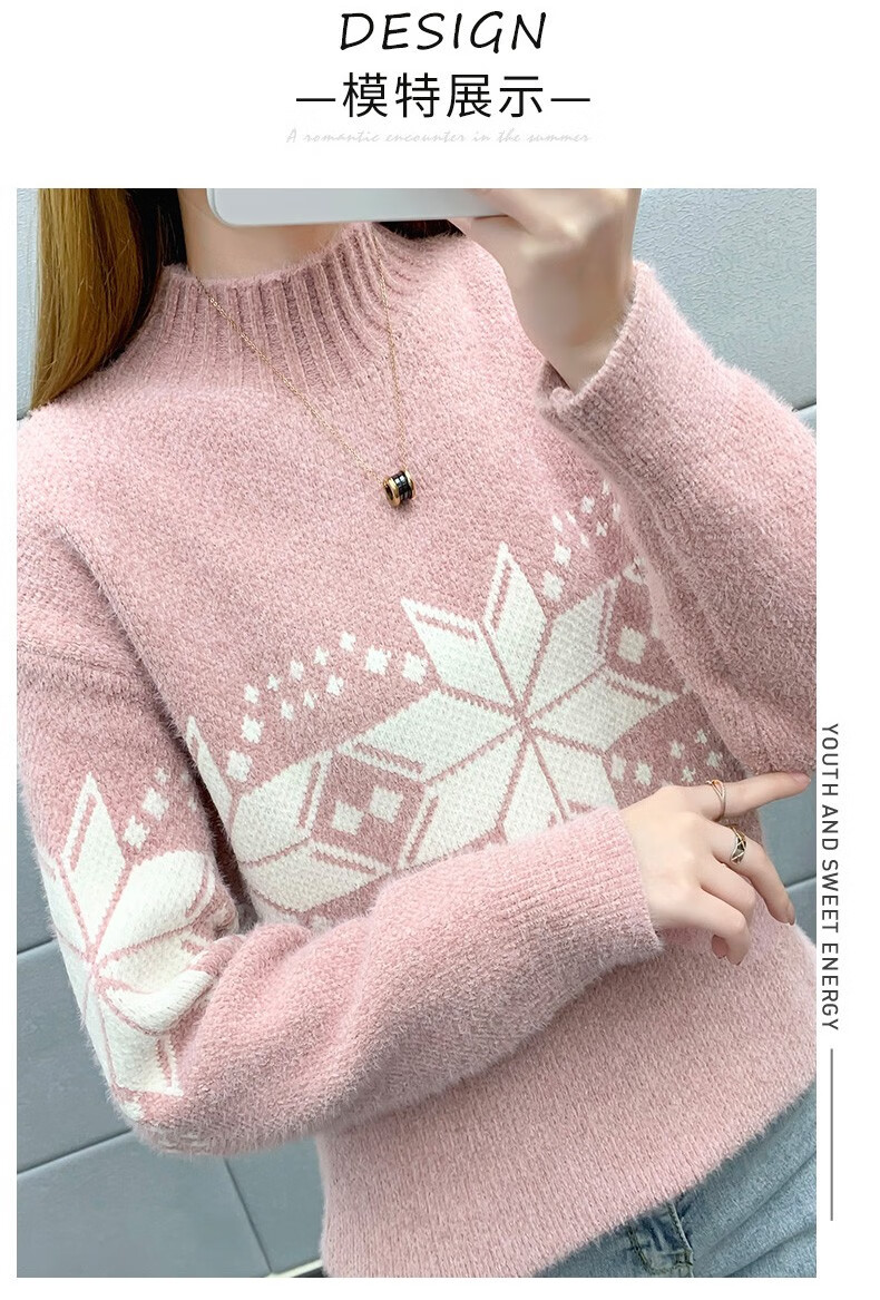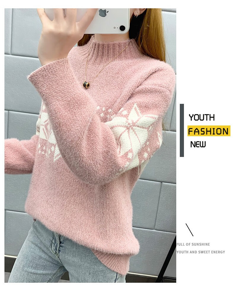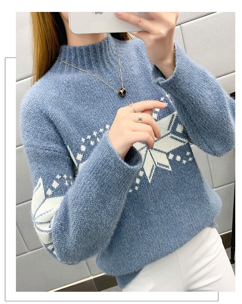 恒源祥针织衫女秋冬装加厚羊毛衫新款女士半高领毛衣女装外穿圣诞上衣 雪花-皮红色 均码 适合体重90-145斤