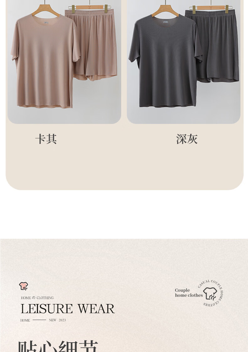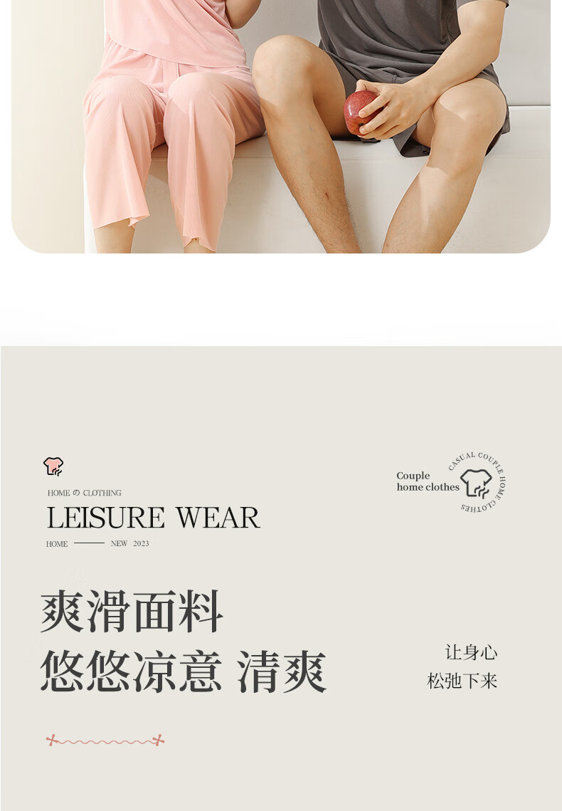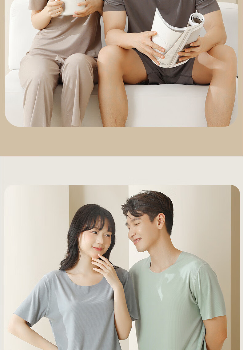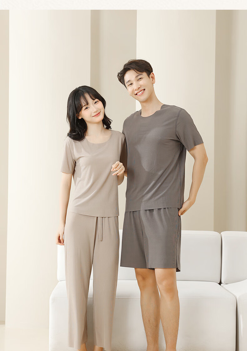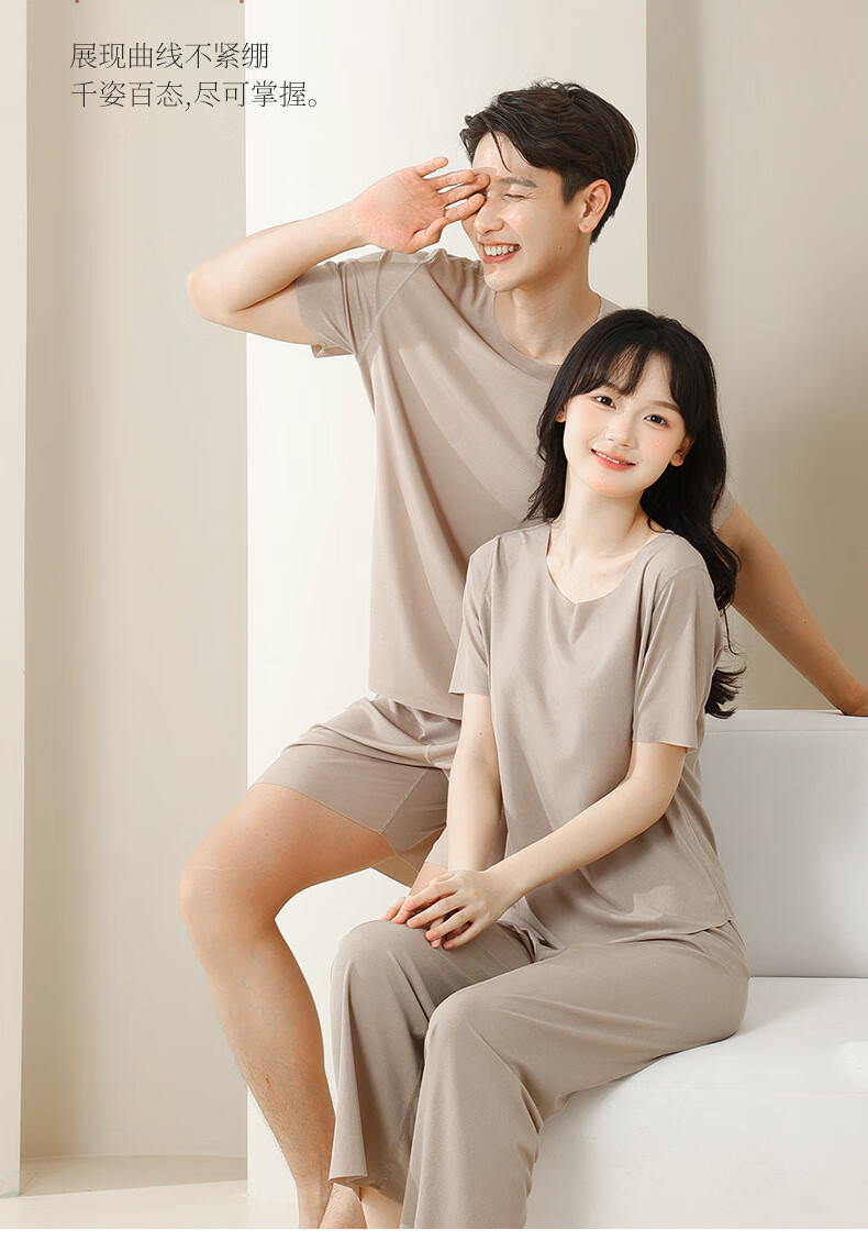 锐图森情侣睡衣女士圆领短袖睡裤套装夏天短裤男薄款无痕冰丝家居 男深灰 XL