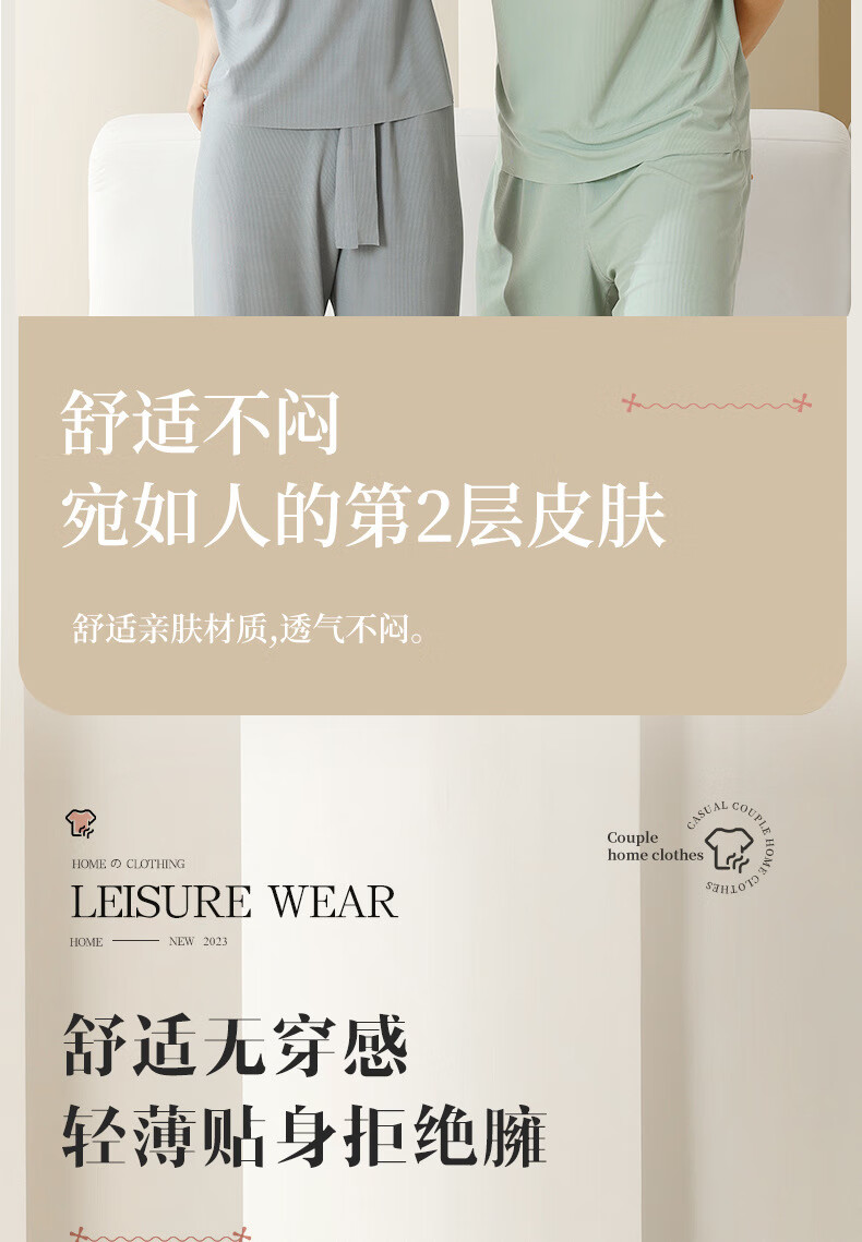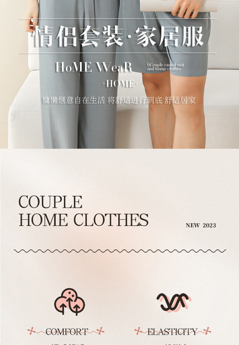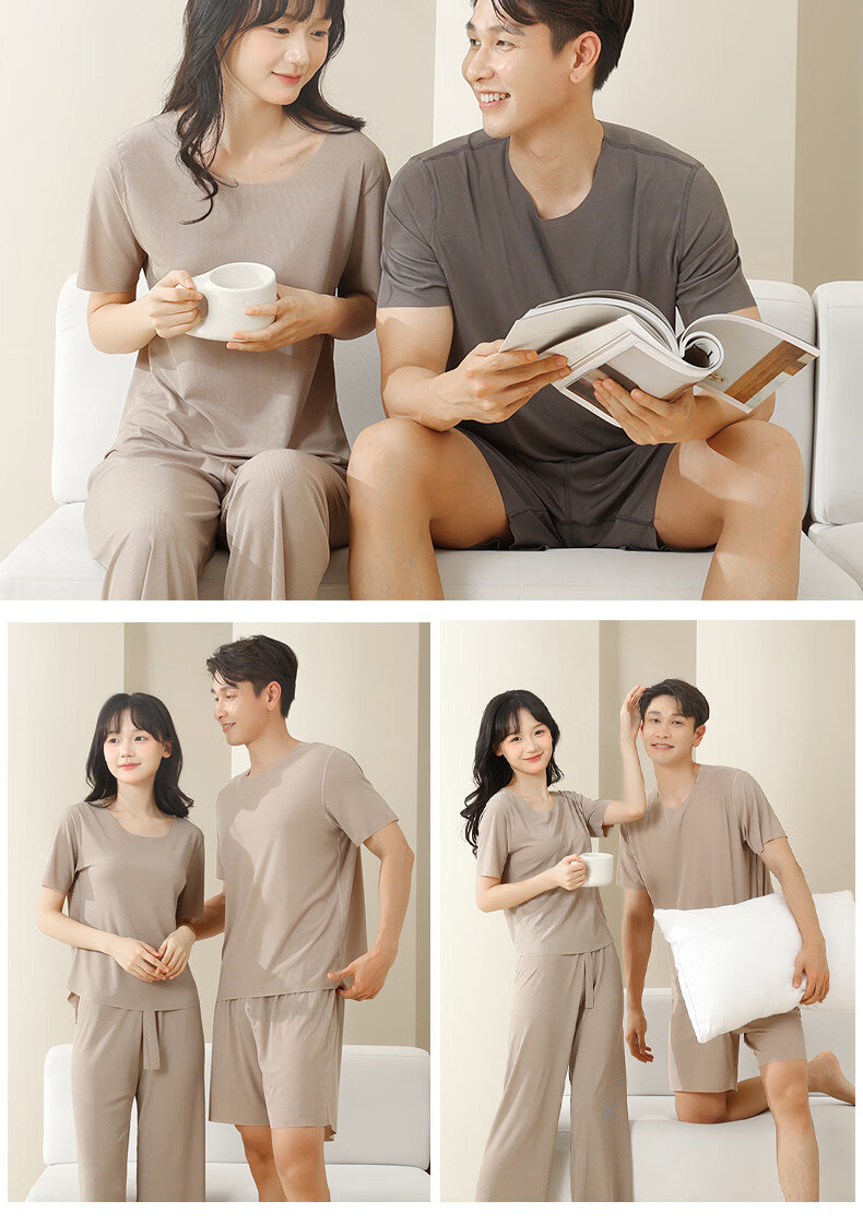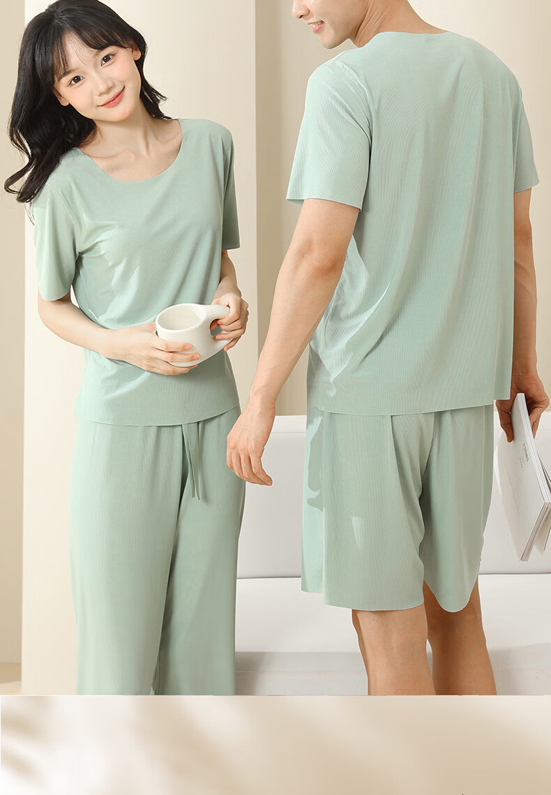 锐图森情侣睡衣女士圆领短袖睡裤套装夏天短裤男薄款无痕冰丝家居 男深灰 XL
