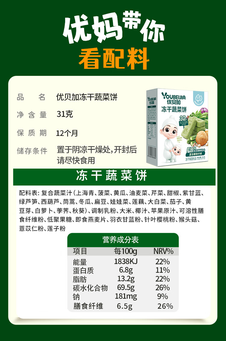 优贝加冻干蔬菜饼干高膳食纤维32种复合果蔬儿童零食营养无添加色素 冻干蔬菜饼*2盒