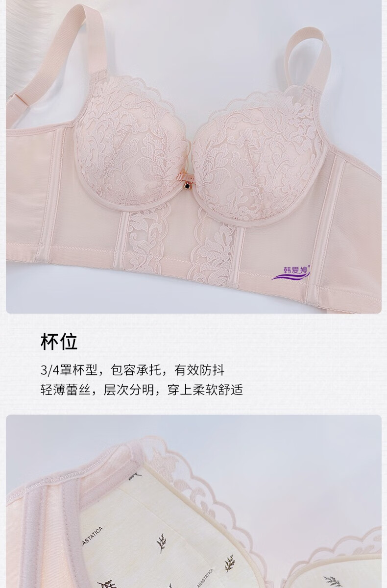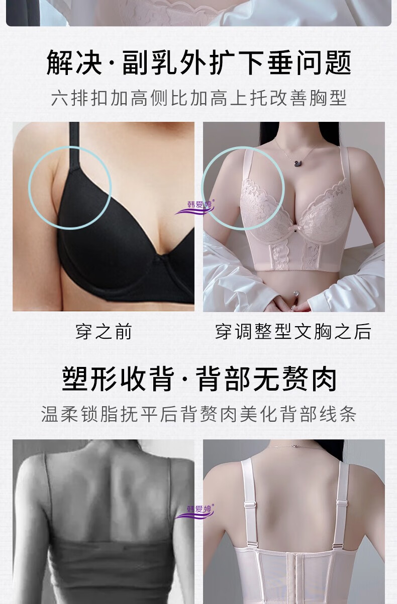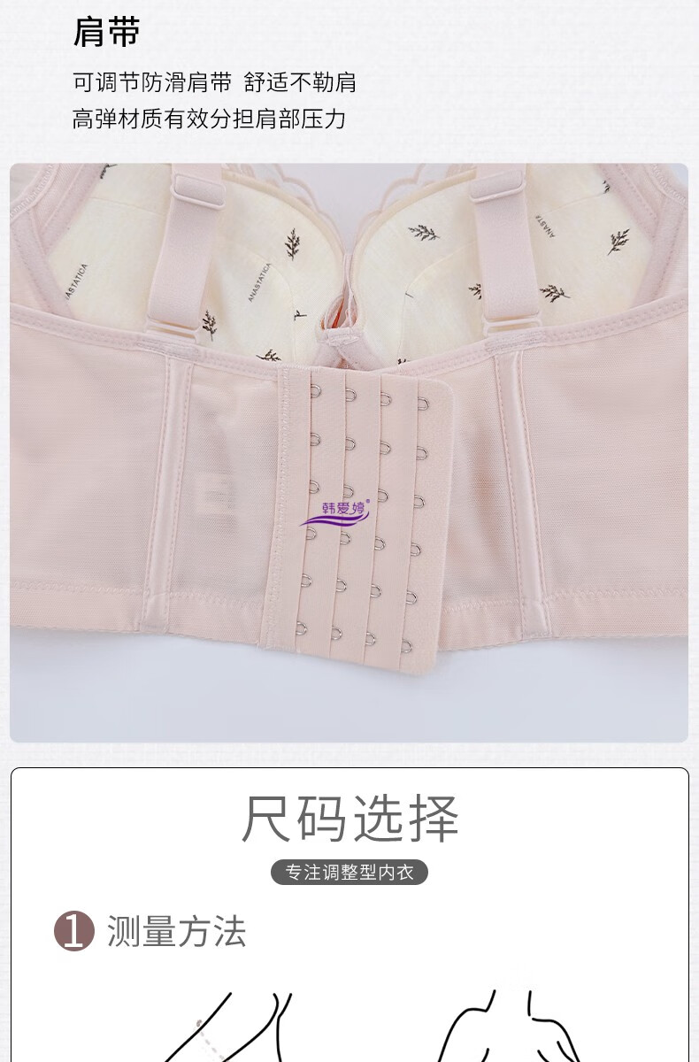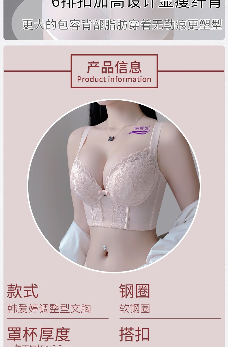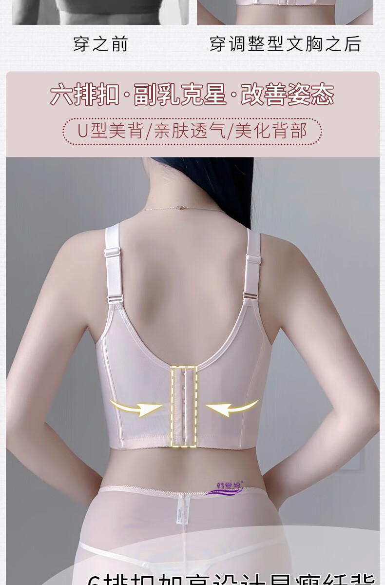 韩爱婷调整型文胸厚款收副乳内衣女小胸聚拢上托防下垂矫正六排扣胸罩夏 粉色【单件】 38/85A【上薄下厚杯2.5CM】