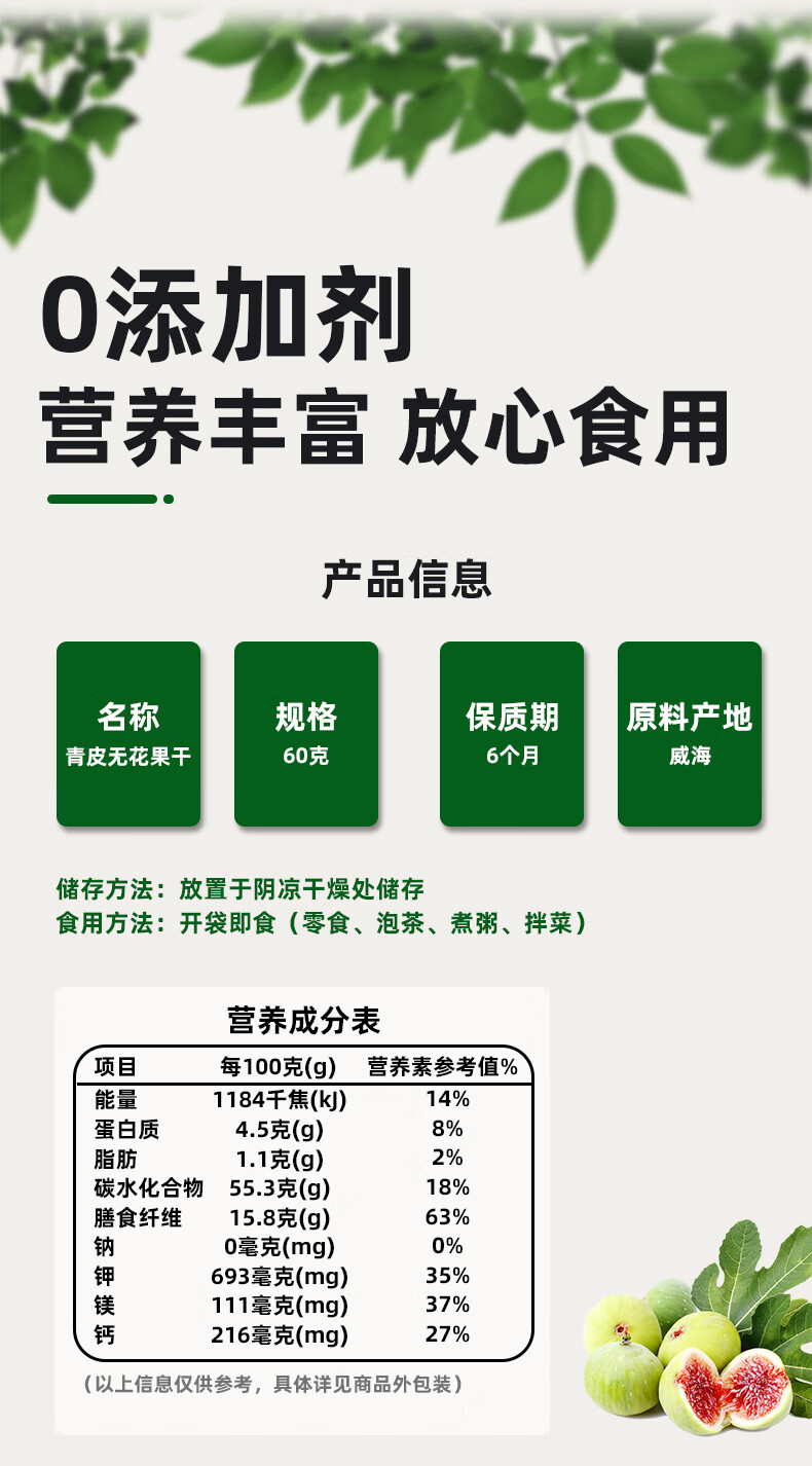 果家班青皮无花果干即食无添加不加糖休闲零食果干精选威海特产泡水煲汤 【权威检测认证】青皮无花果干60g*2袋