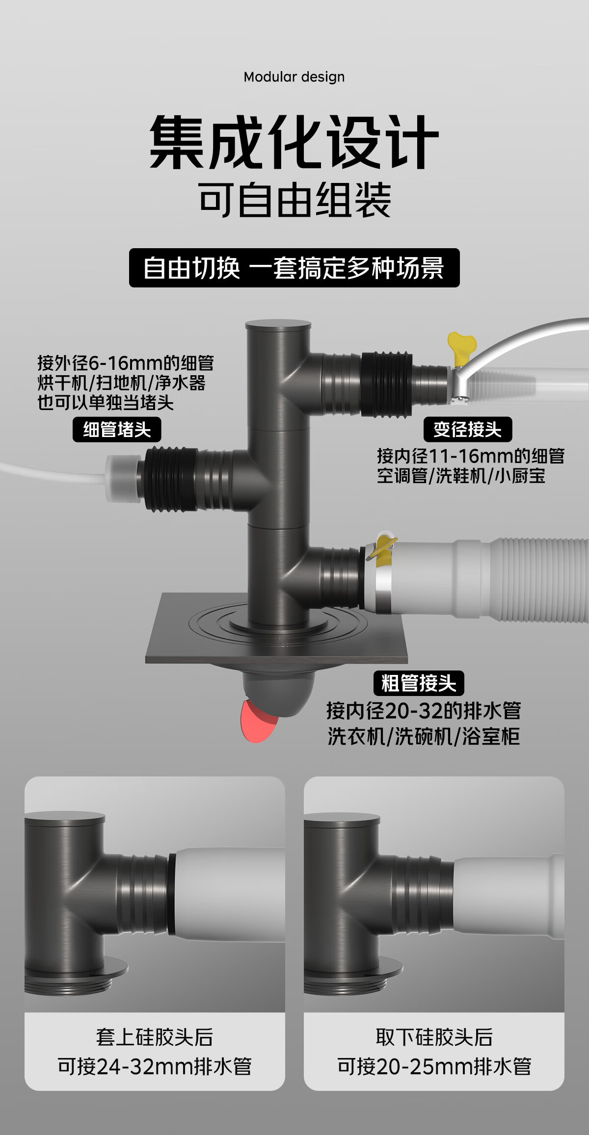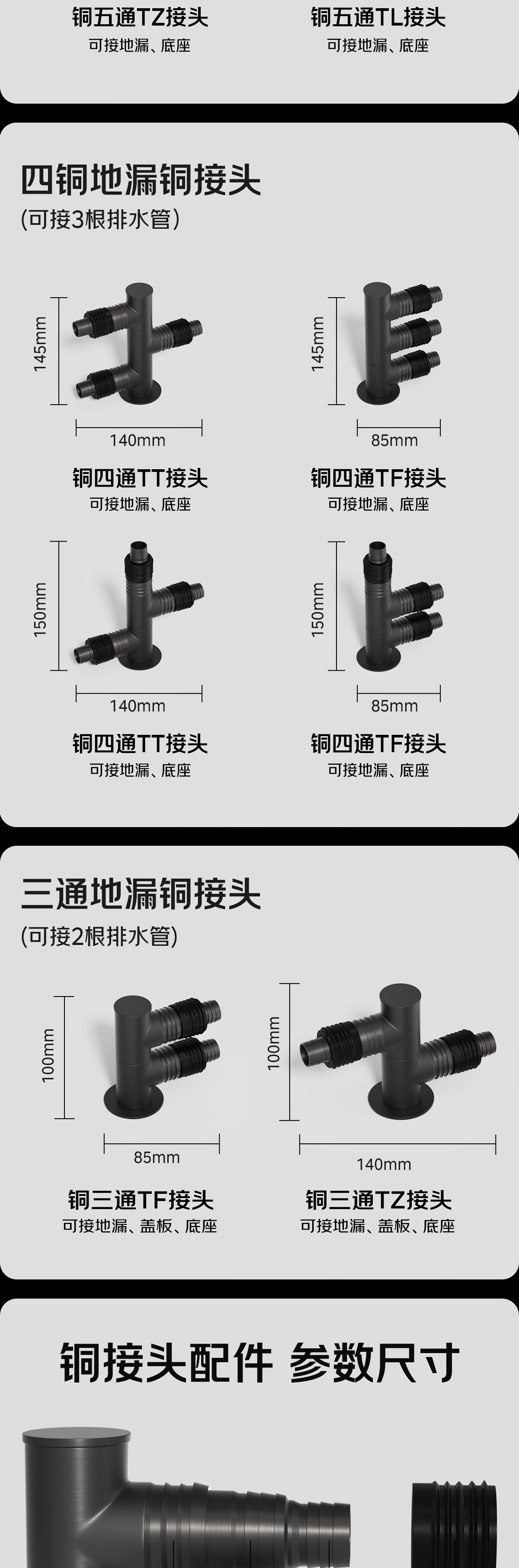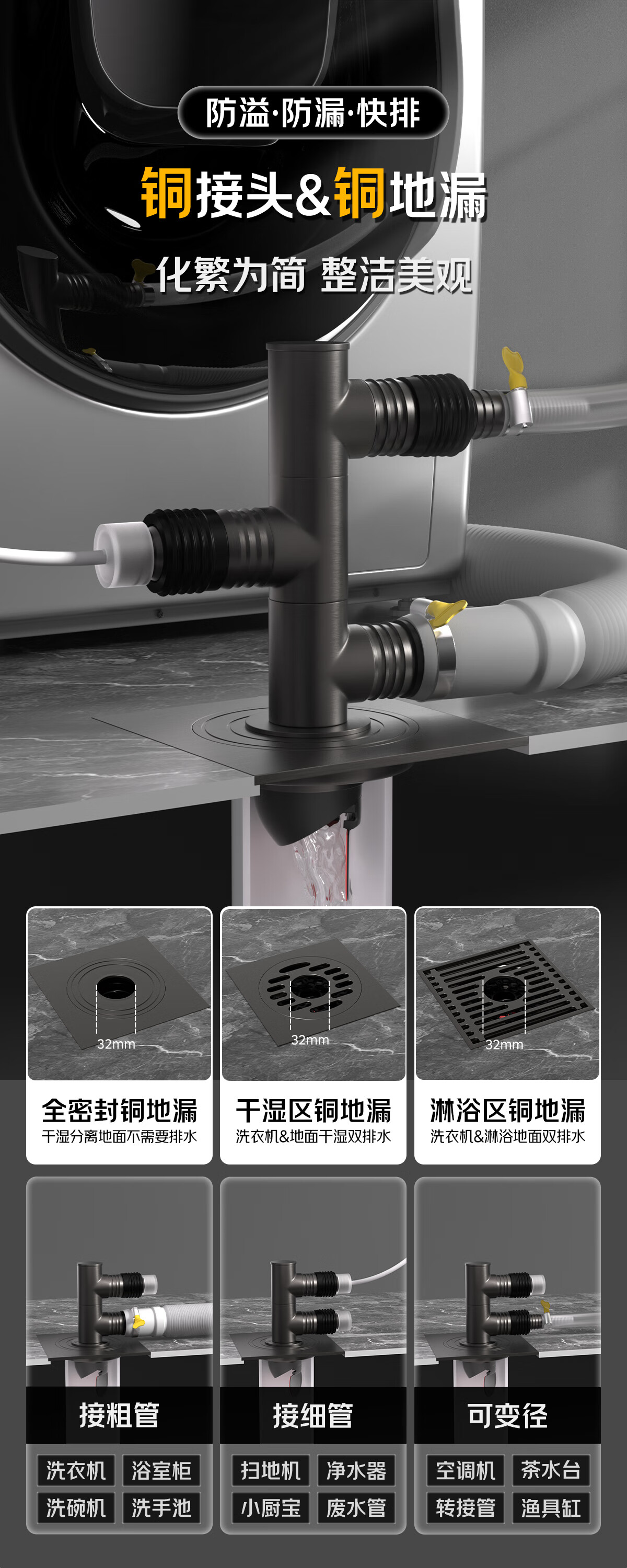 秘浴洗衣机下水三通地漏铜接头厨卫装修改造扫地机集成排水管连接 三通TF铜接头+淋浴区铜地漏(接2根管)
