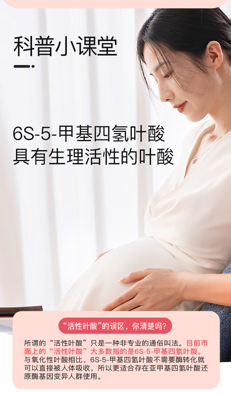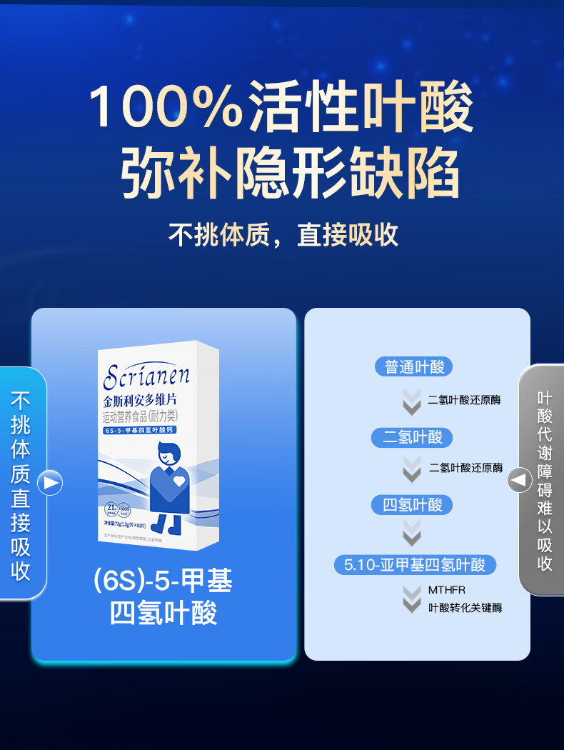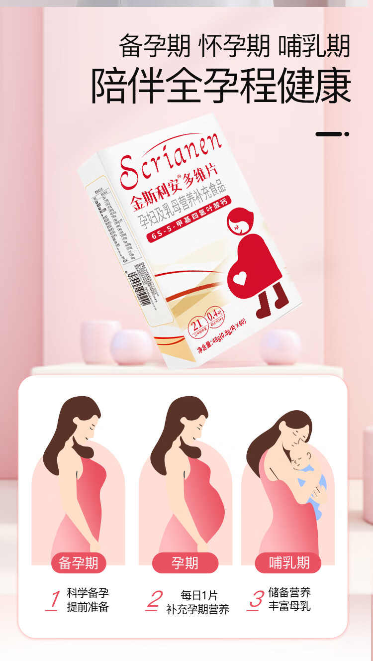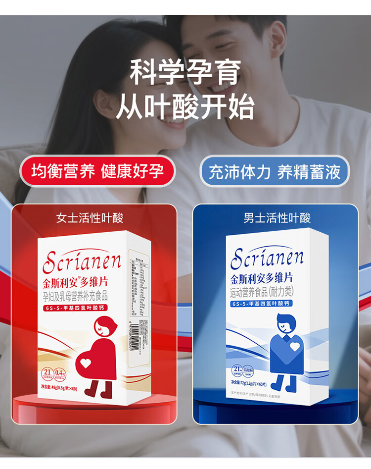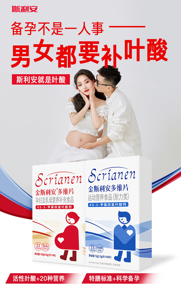 斯利安男女活性叶酸组合120粒无碘配方6S-5-甲基四氢叶酸钙夫妻备孕适用