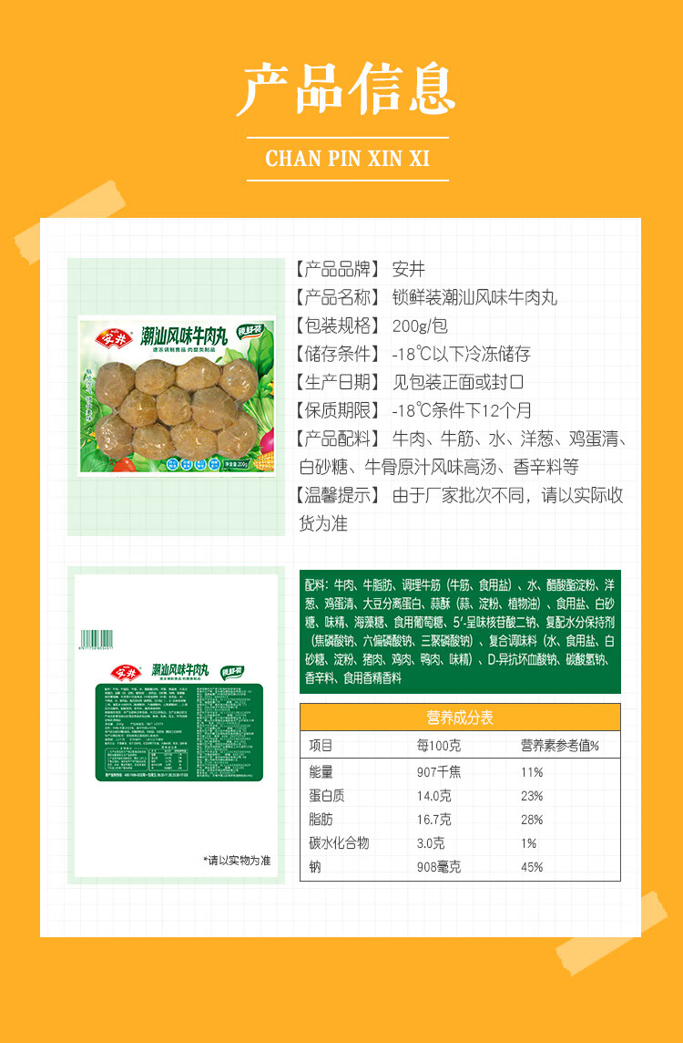 安井 潮汕牛肉丸 200g 1包 牛肉+牛筋含量≥65% 火锅麻辣烫关东煮食材
