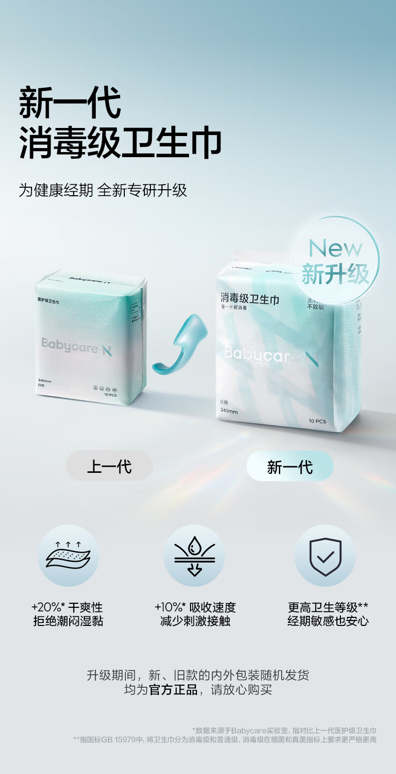 小Nbabycare消毒级日用卫生巾女经期姨妈巾240mm10片京东自营旗舰店
