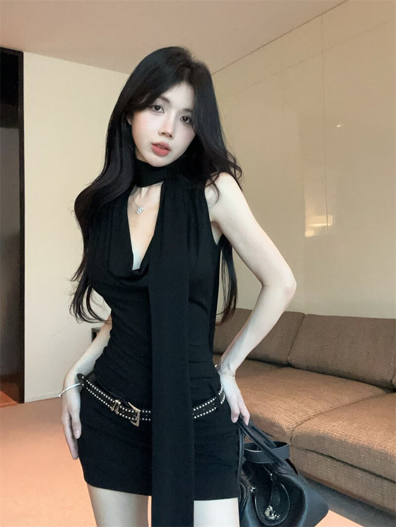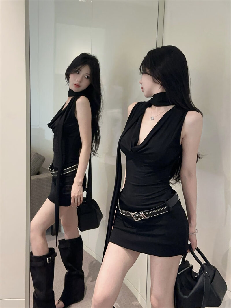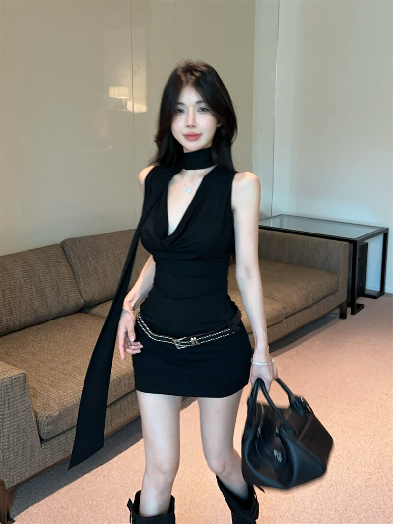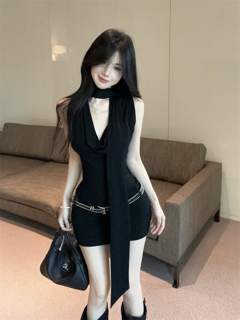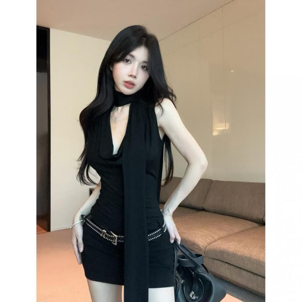 MODX性感辣妹收腰显瘦无袖荡领连衣裙女飘带设计感小众黑色包臀短裙子 黑色 S