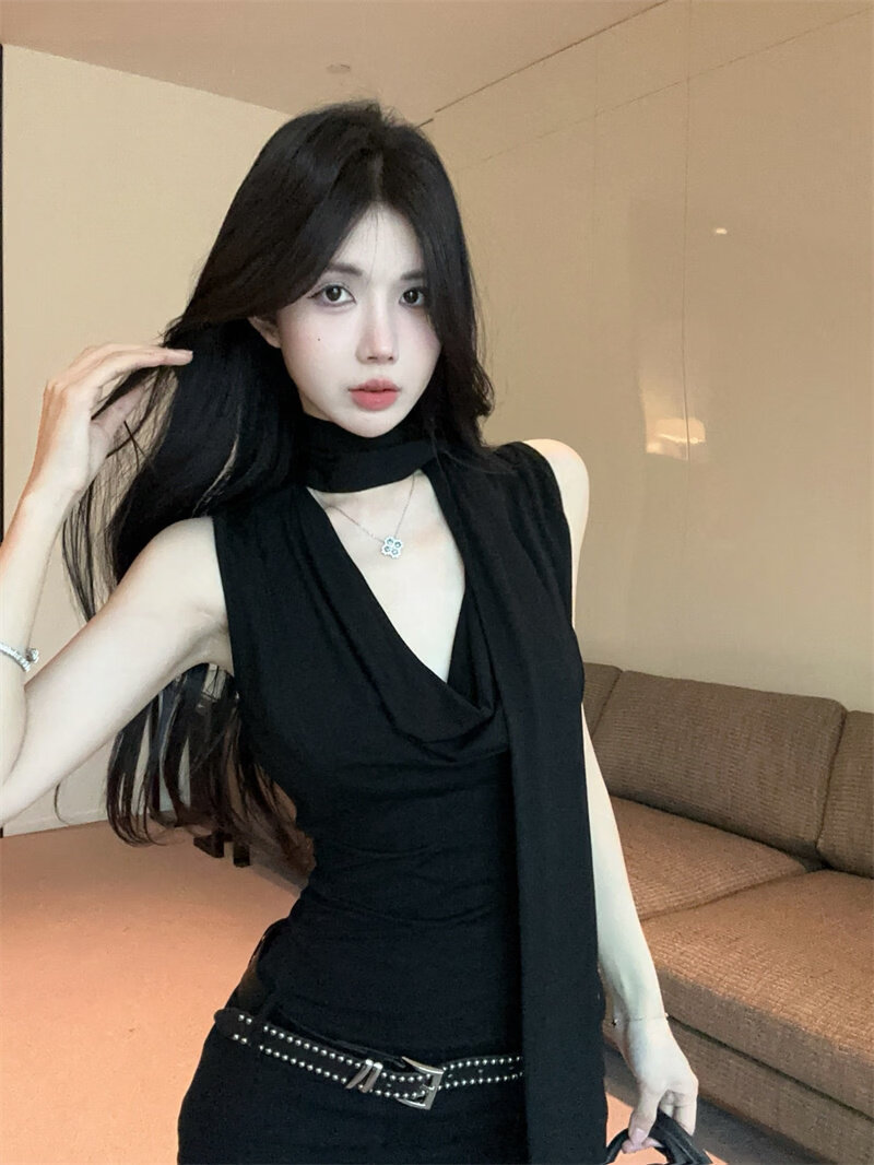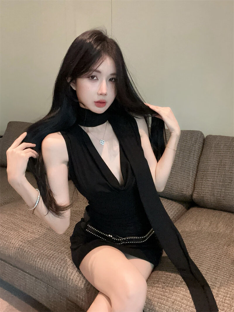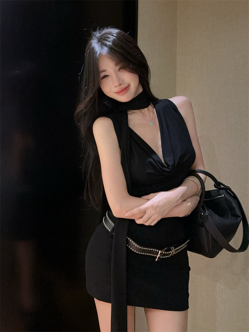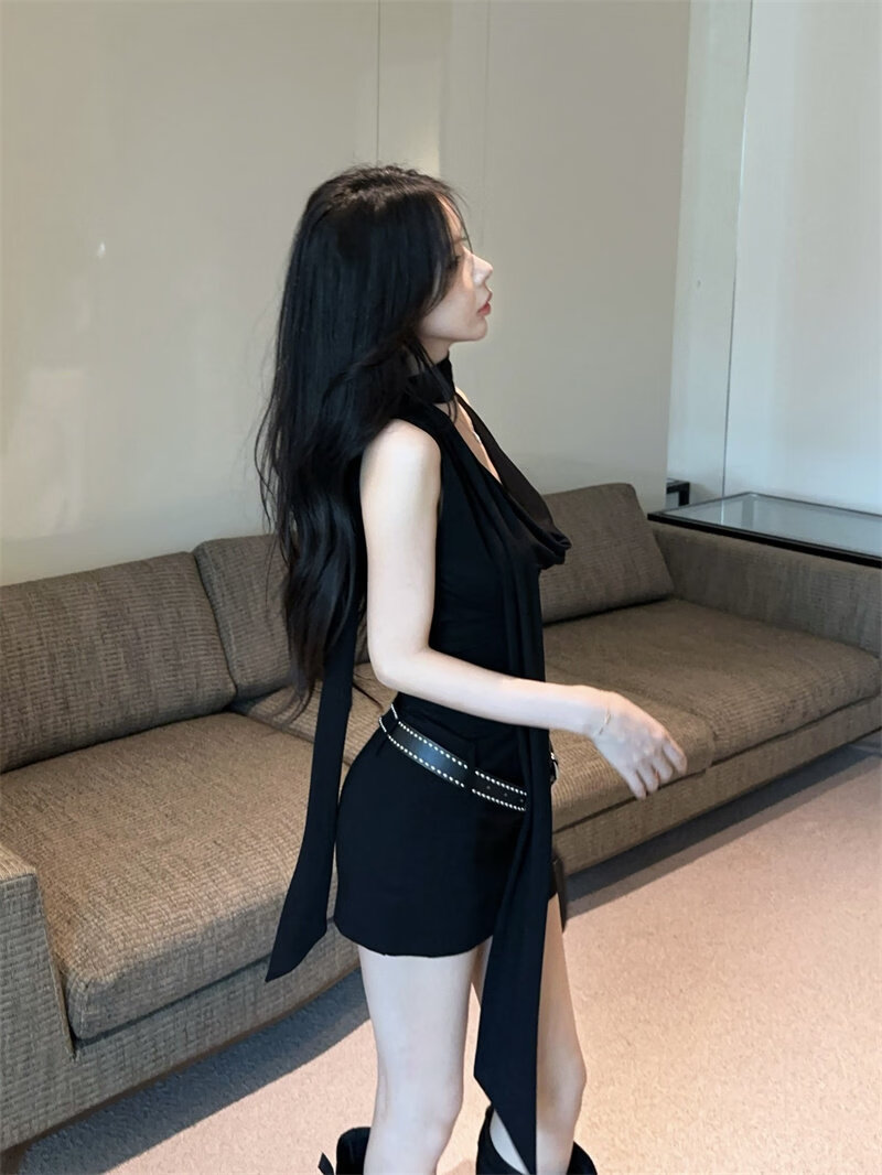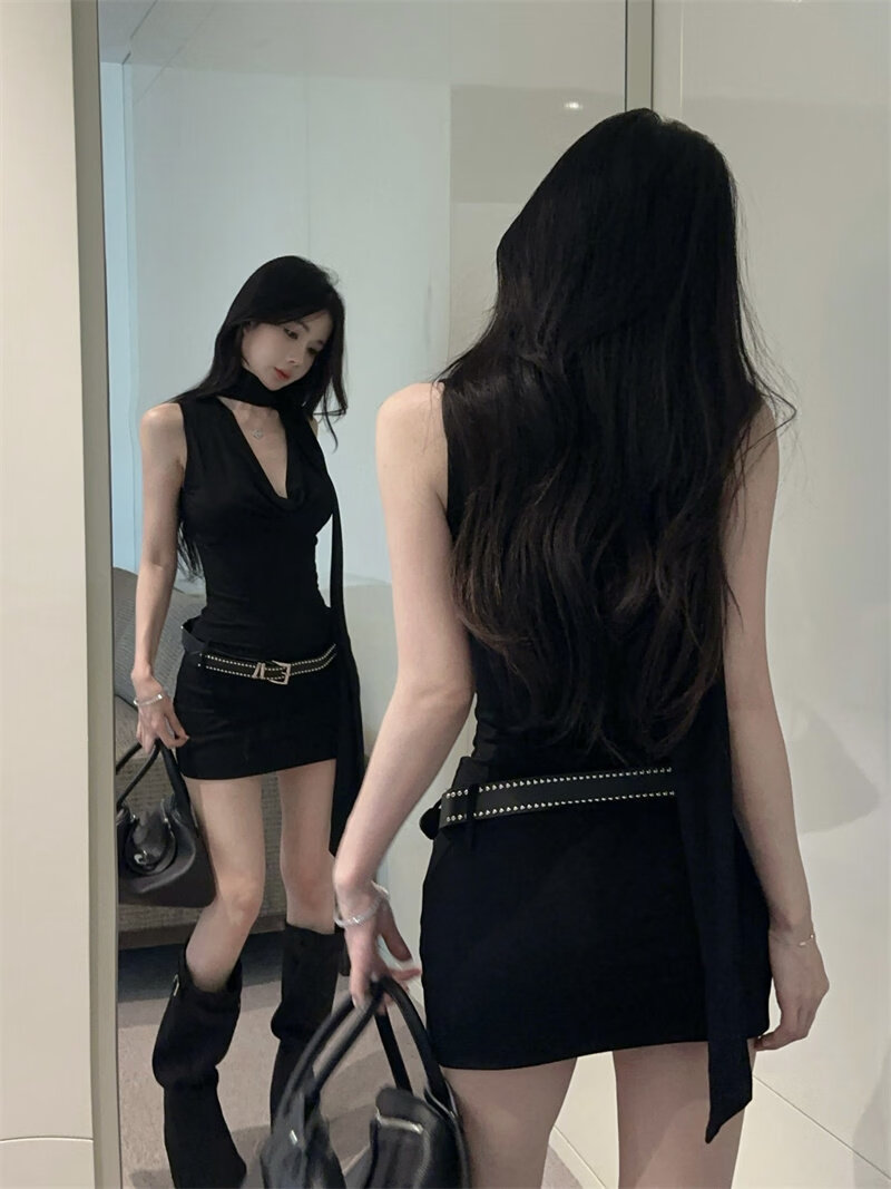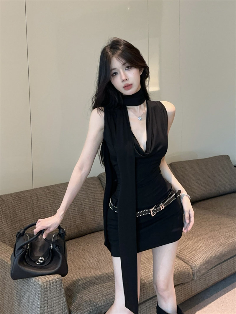 MODX性感辣妹收腰显瘦无袖荡领连衣裙女飘带设计感小众黑色包臀短裙子 黑色 S