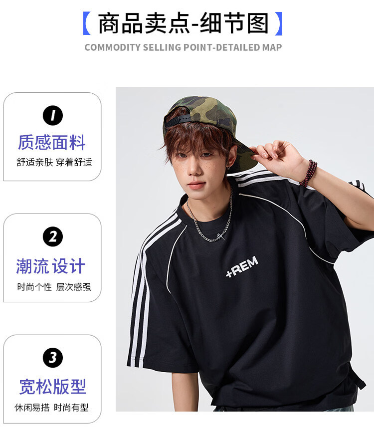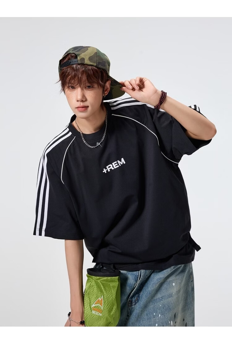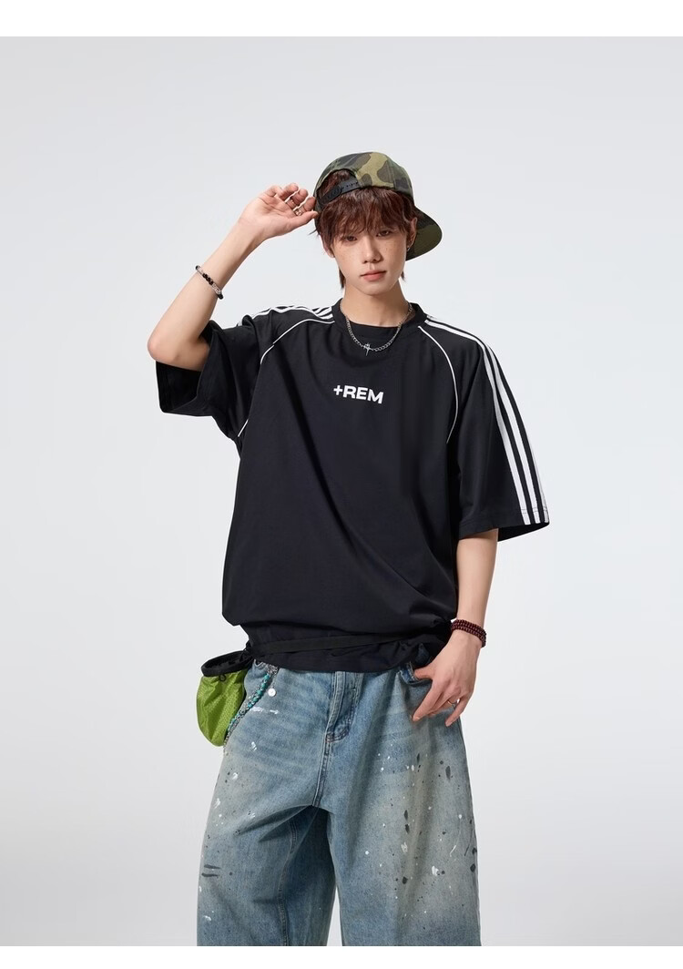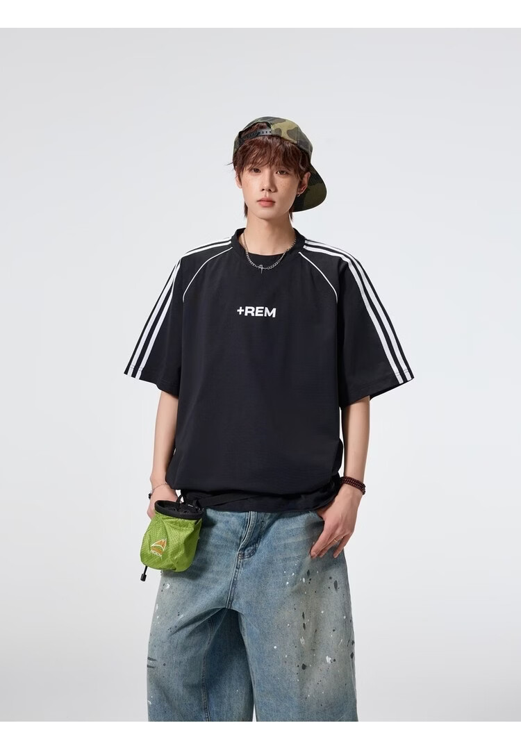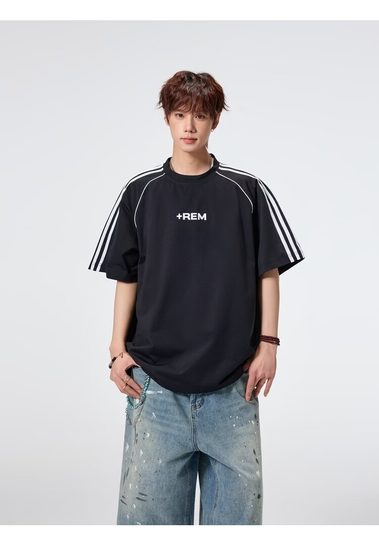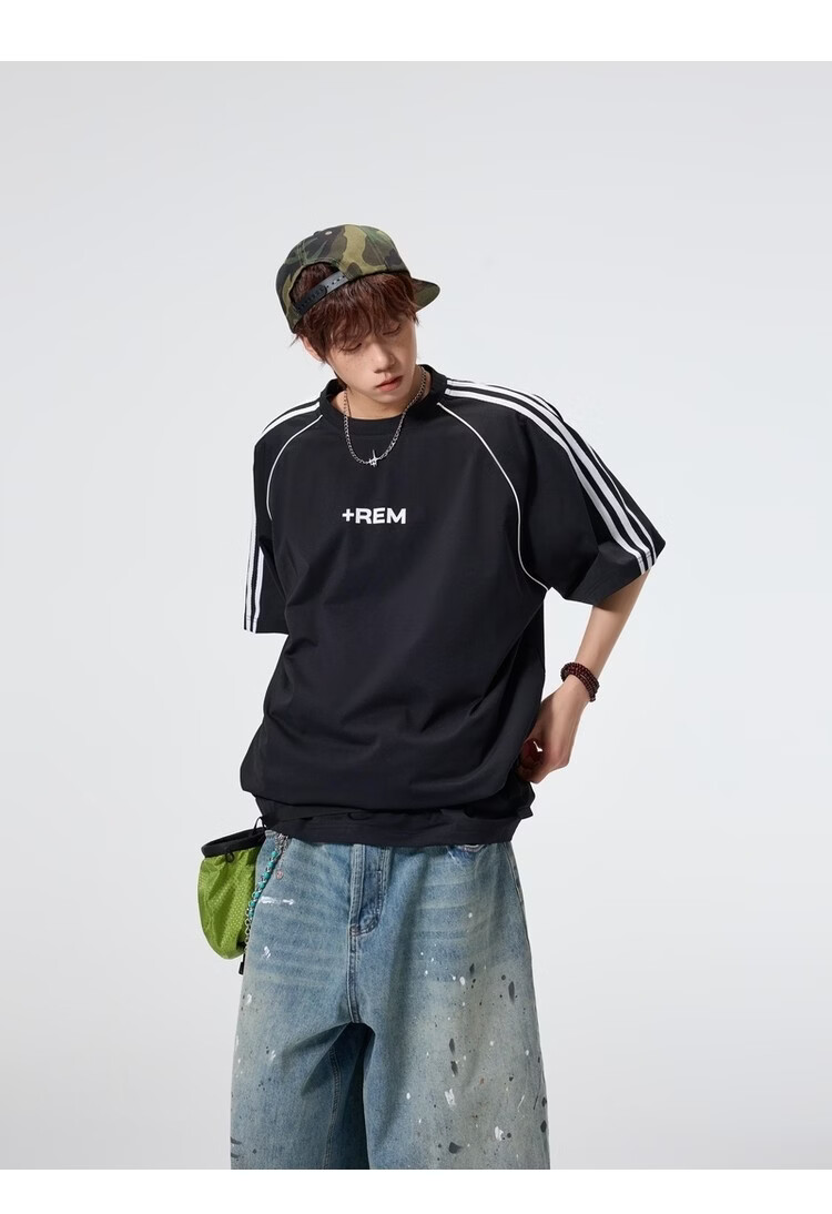 NEW OR MODE美式条纹运动短袖t恤男夏季潮牌高街痞帅青少年宽松休闲半袖上衣 黑色【高品质】 M 【建议90-110斤】