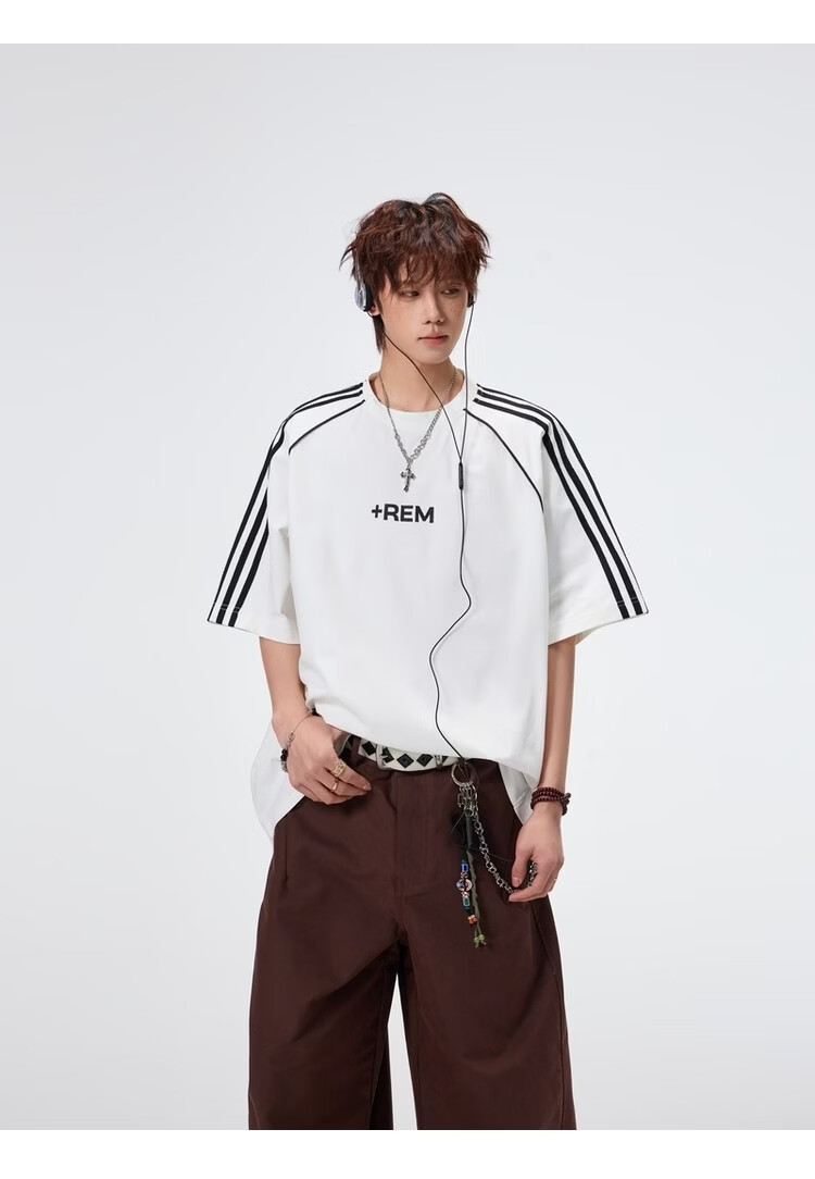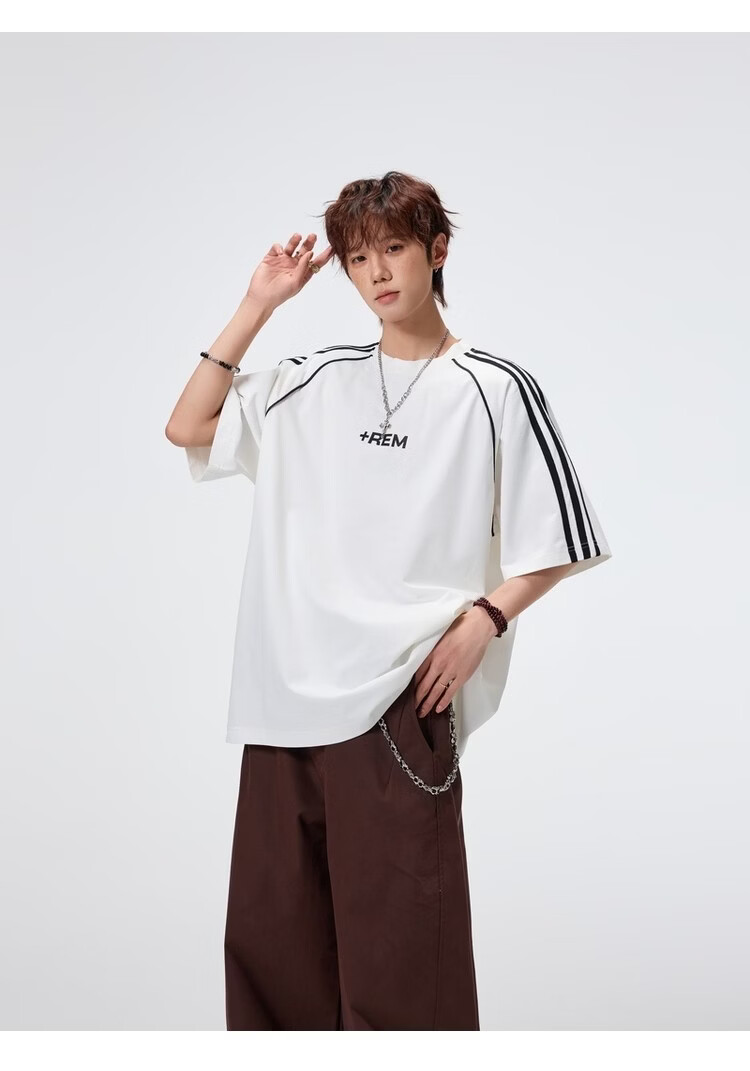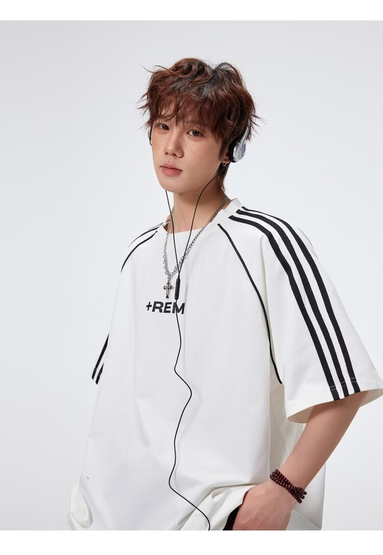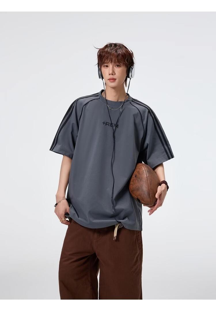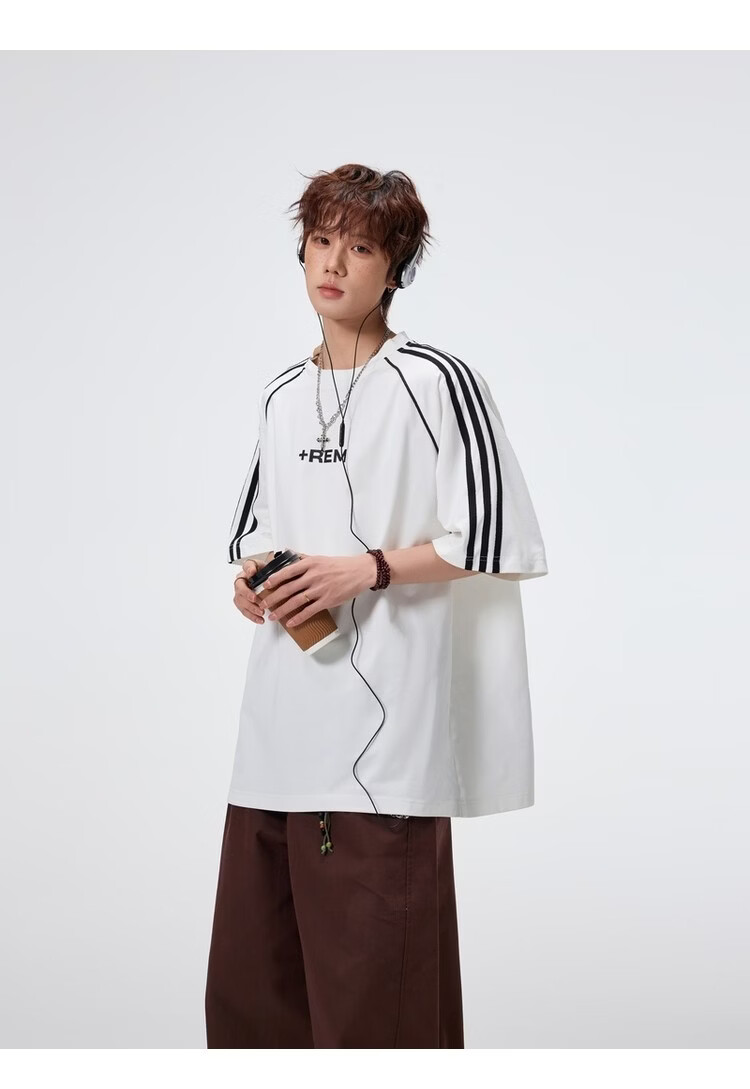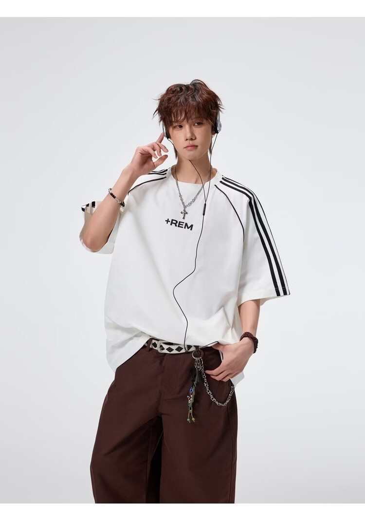 NEW OR MODE美式条纹运动短袖t恤男夏季潮牌高街痞帅青少年宽松休闲半袖上衣 黑色【高品质】 M 【建议90-110斤】