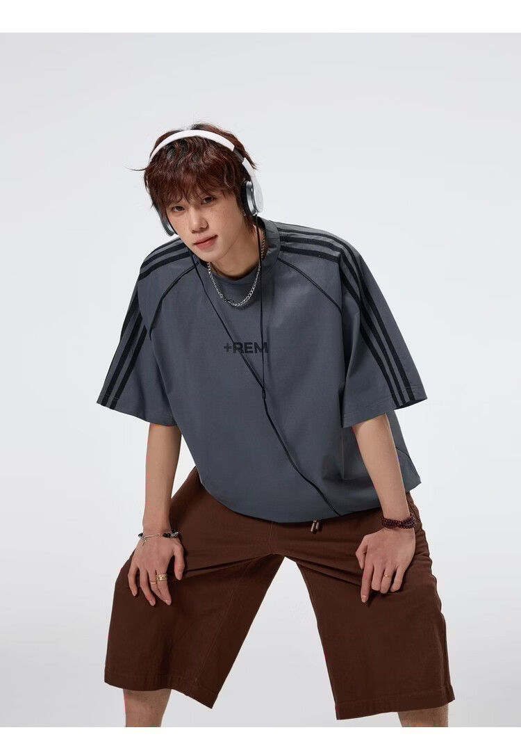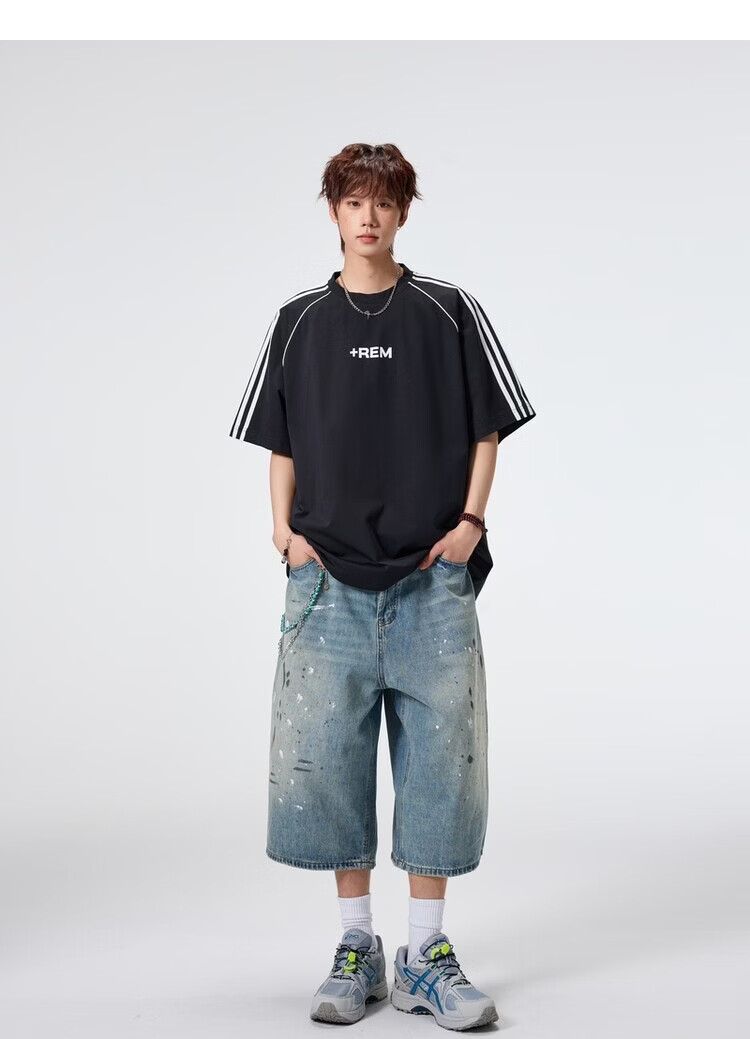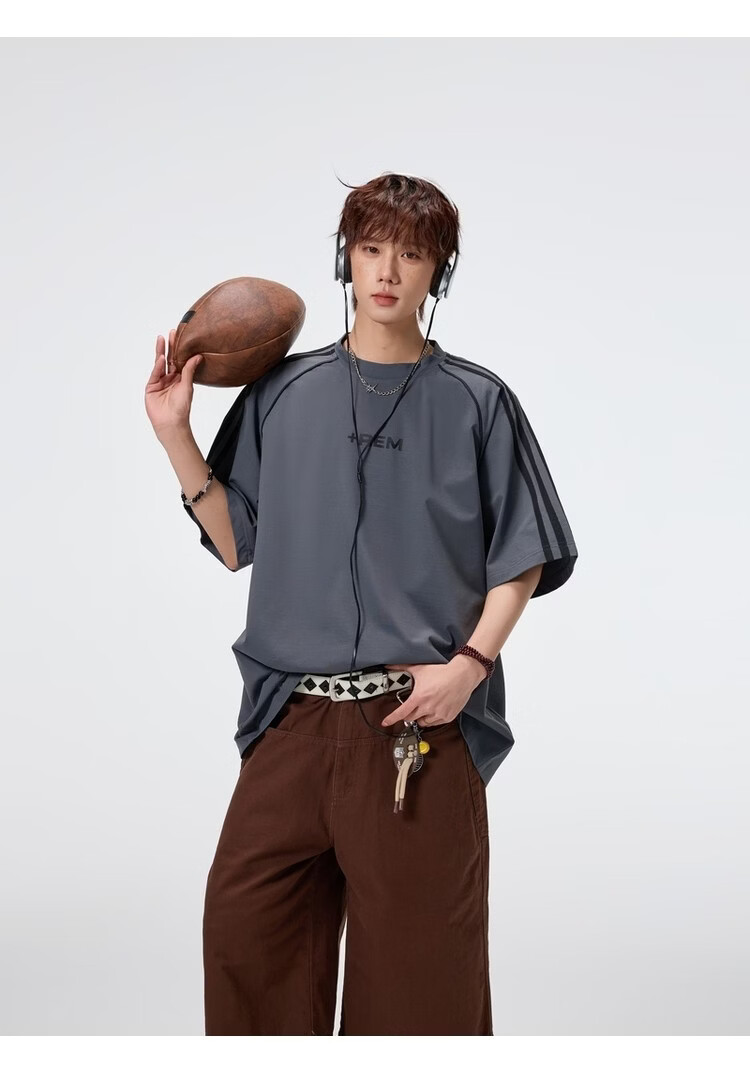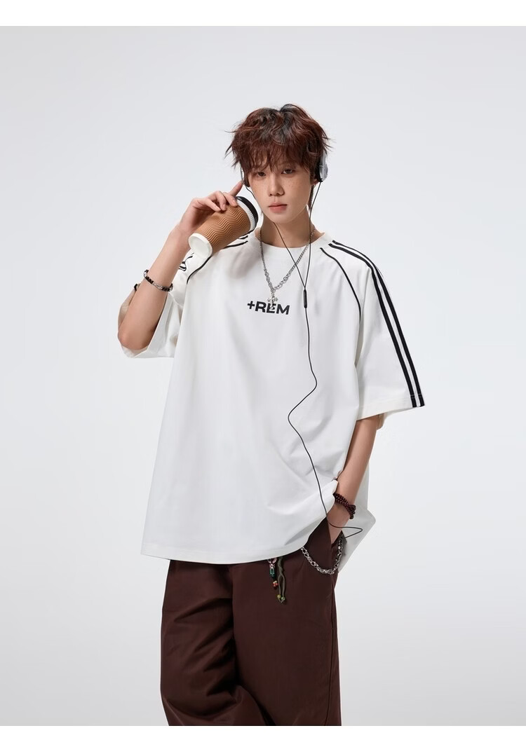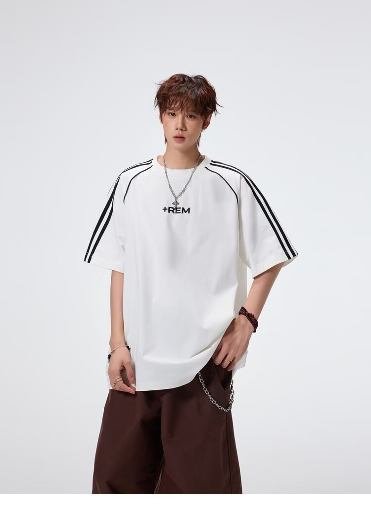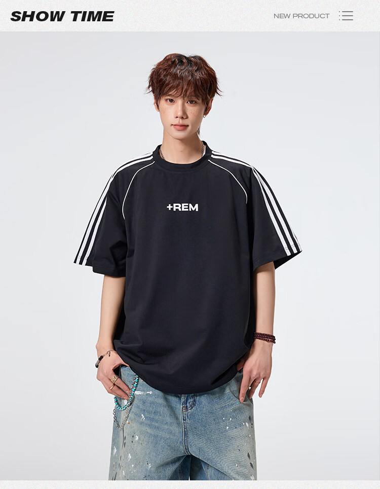NEW OR MODE美式条纹运动短袖t恤男夏季潮牌高街痞帅青少年宽松休闲半袖上衣 黑色【高品质】 M 【建议90-110斤】