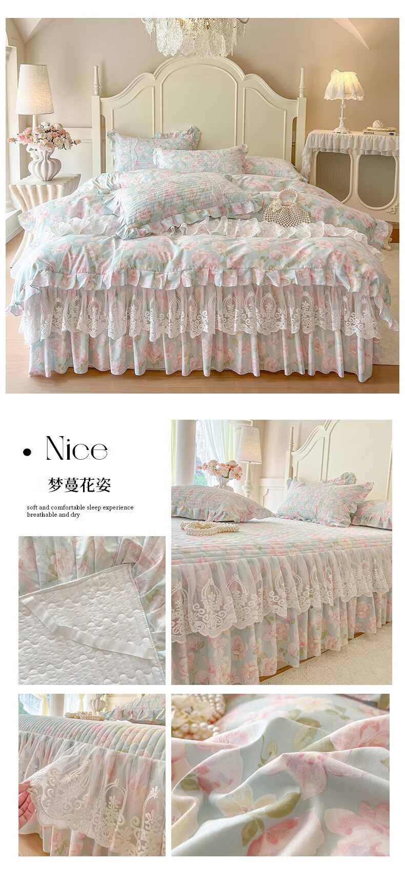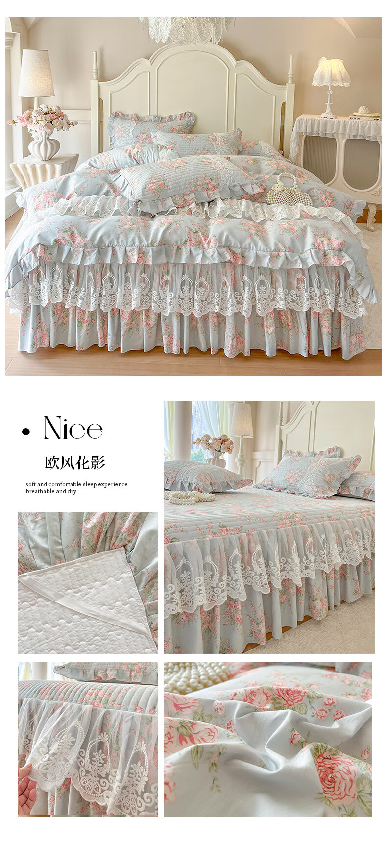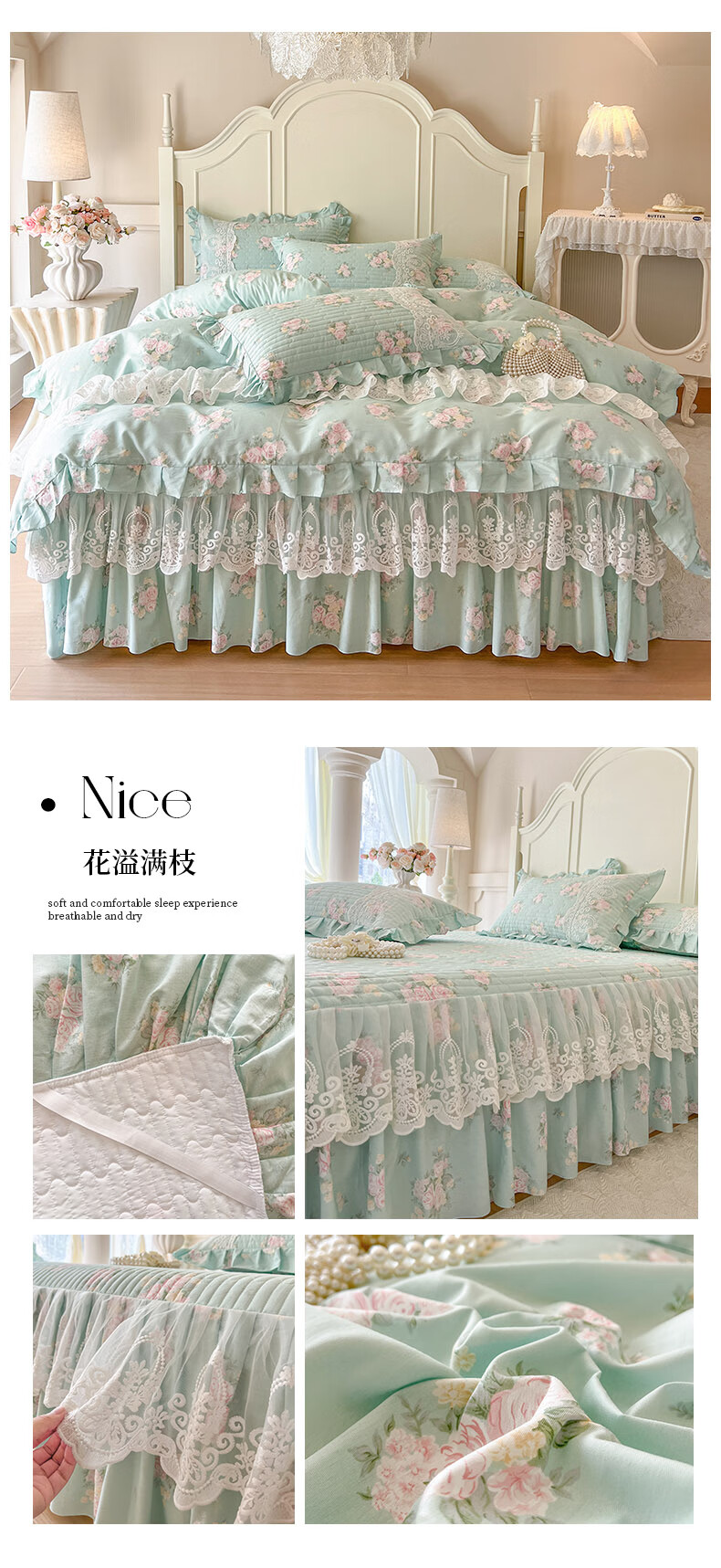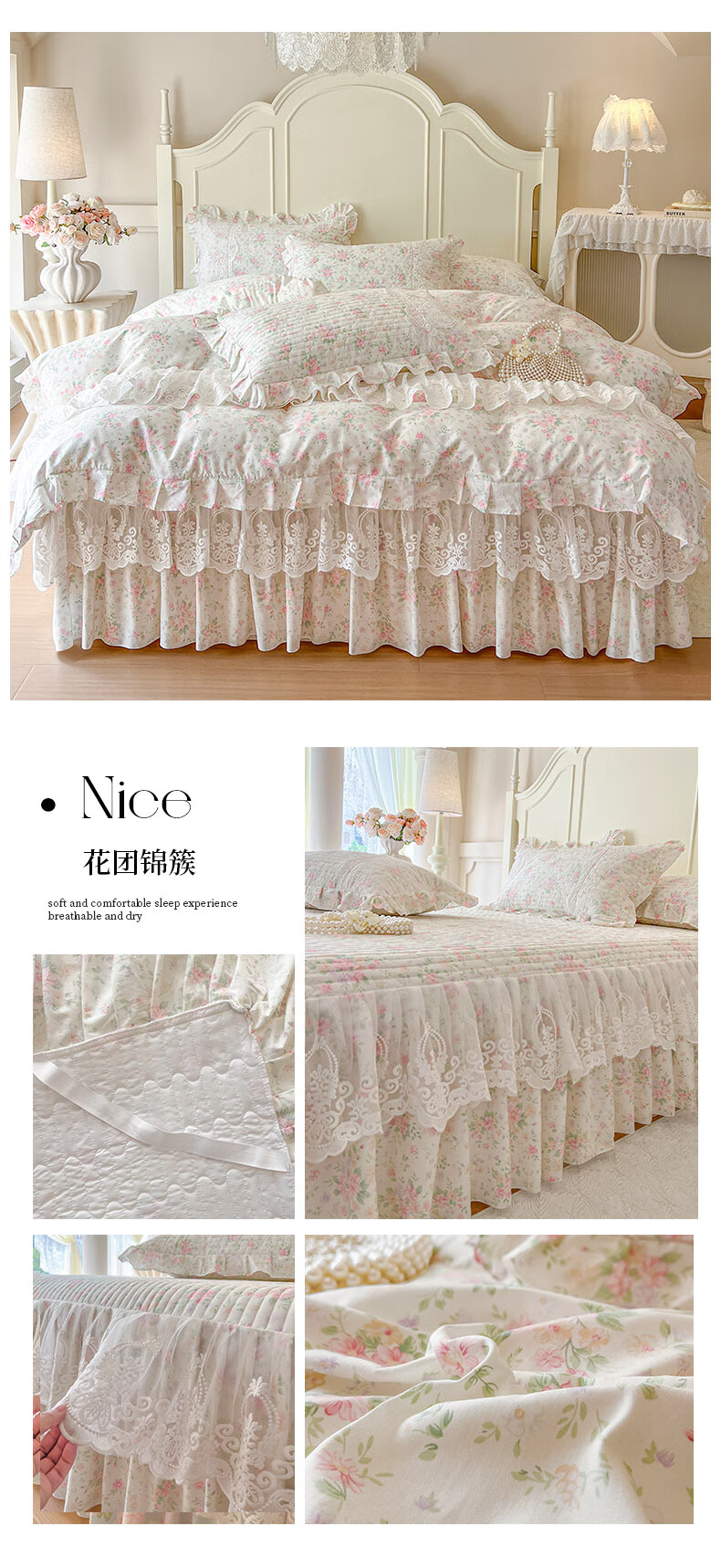 元族2025新款全棉纯棉印花床裙四件套床裙 花团锦簇 床裙款 1.5四件套-被套200x230