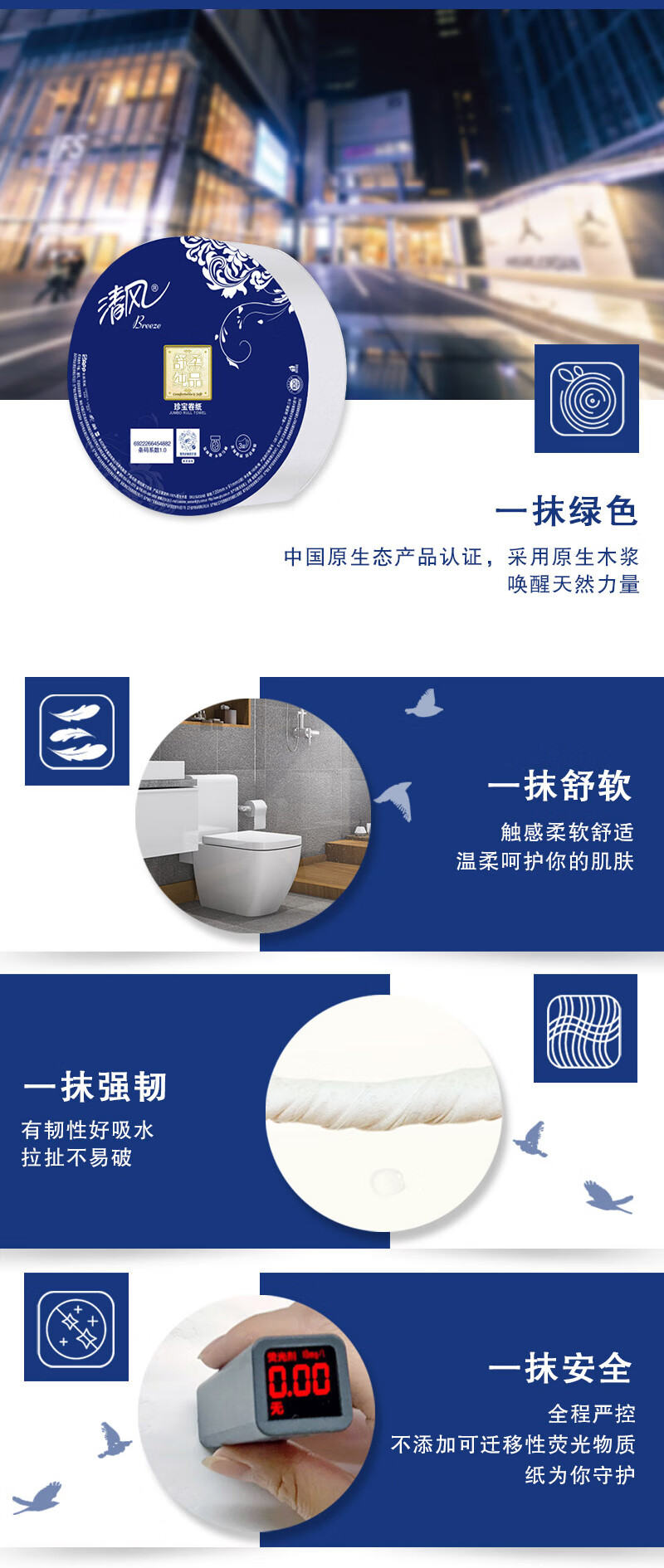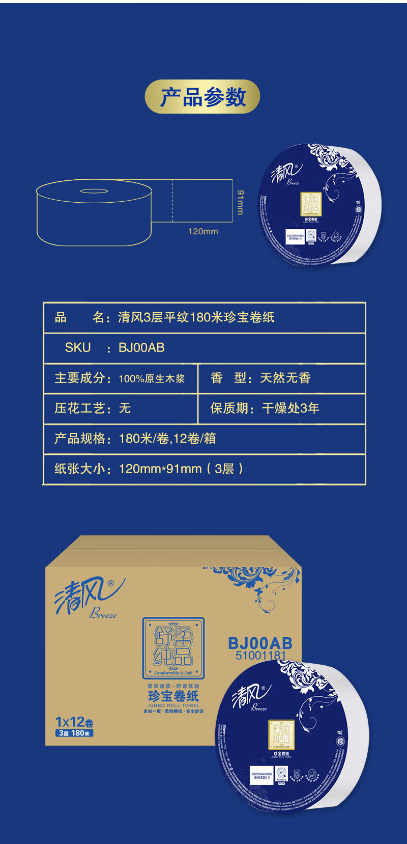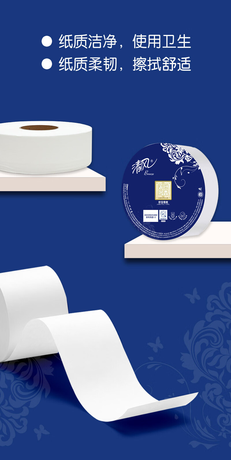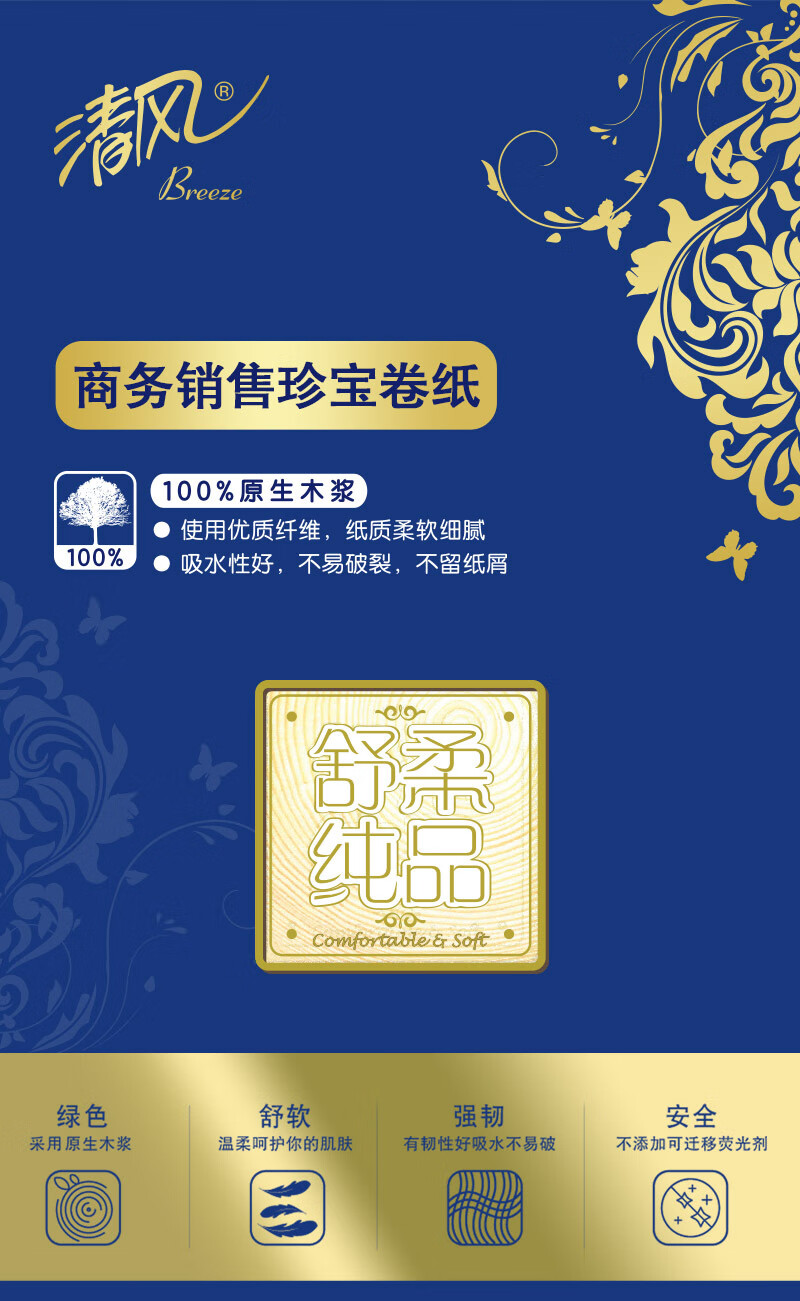 清风有芯卷纸3层180米*12卷 大盘纸 商用商场酒店卫生纸厕纸 整箱销售