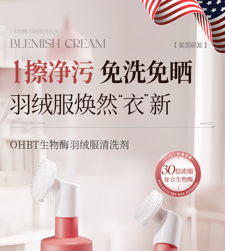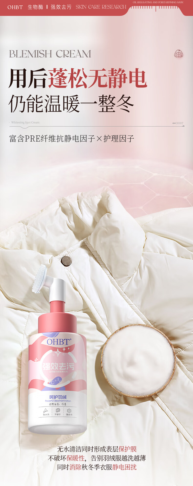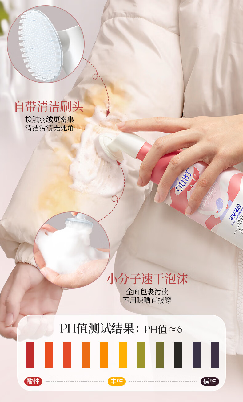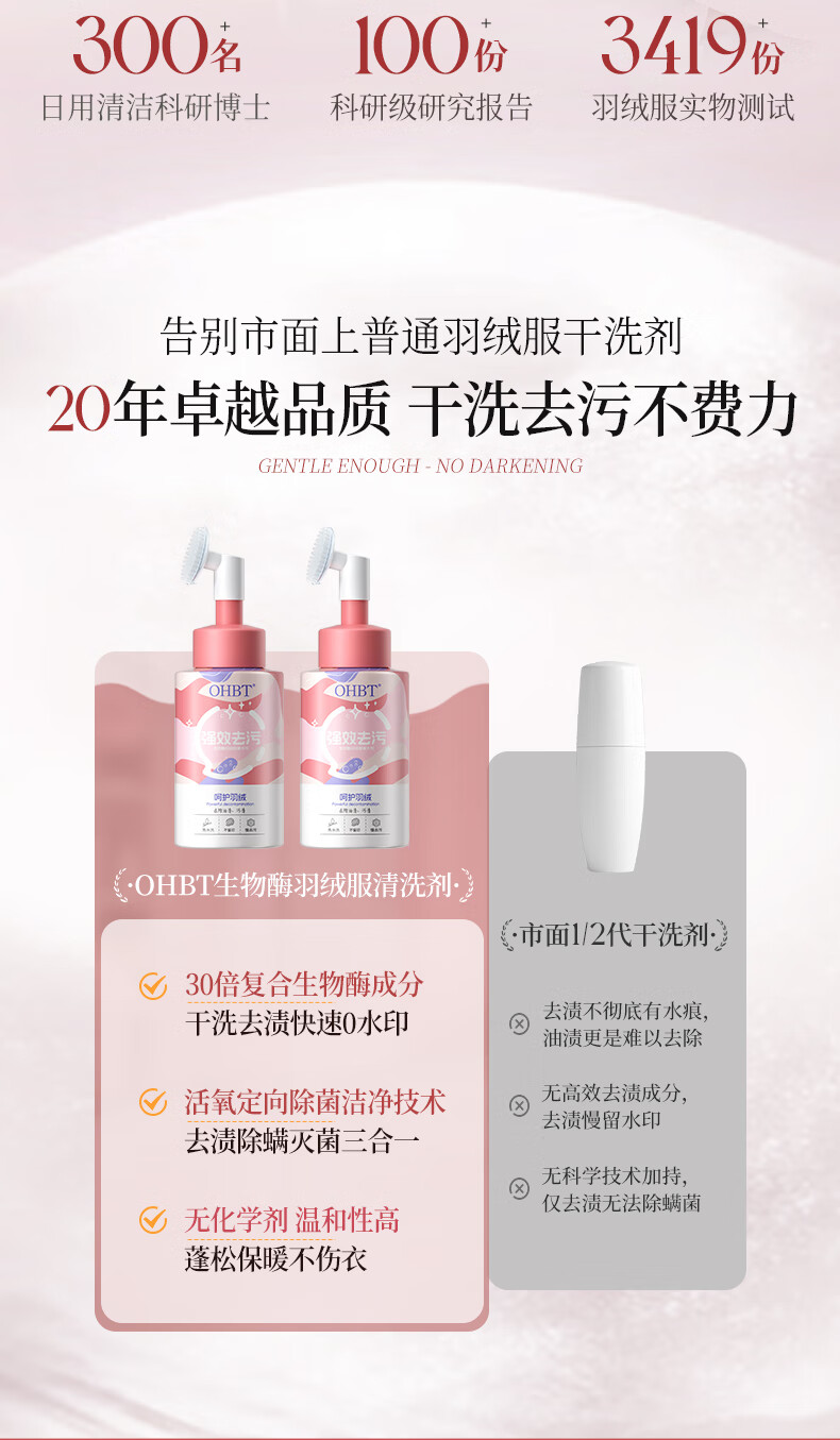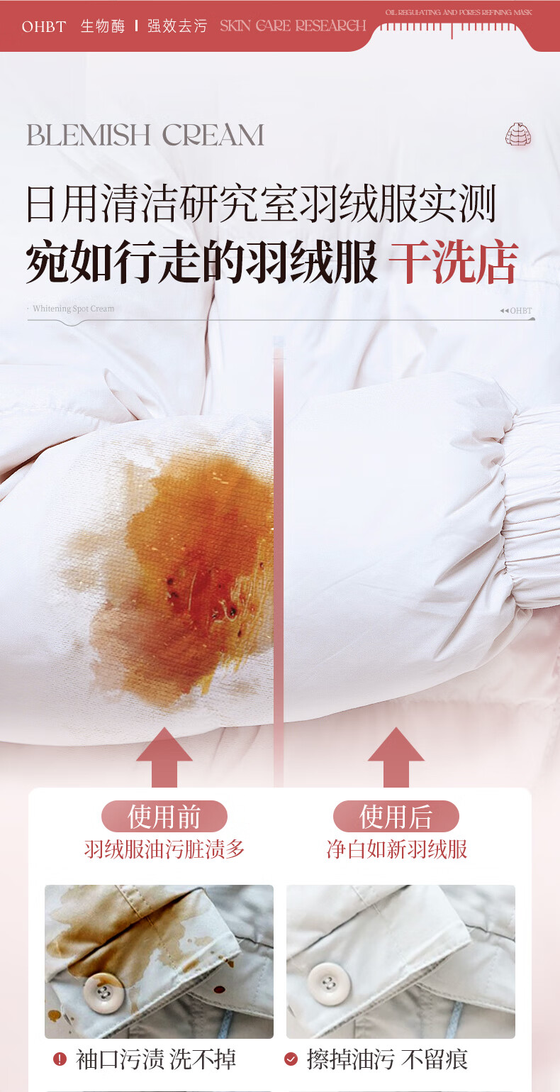 OHBT羽绒服清洗剂免水干洗剂蓬松洗涤剂强力去油污去渍一擦净清洁神器 1瓶265ml【轻松搞定污渍】